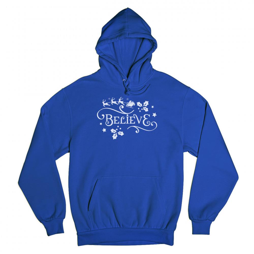 BELIEVE sweatshirt merry christmas santa sleigh rudolph mistletoe hoodie royal blue
