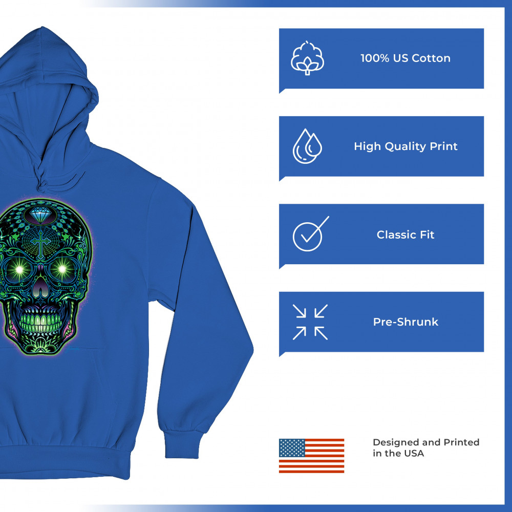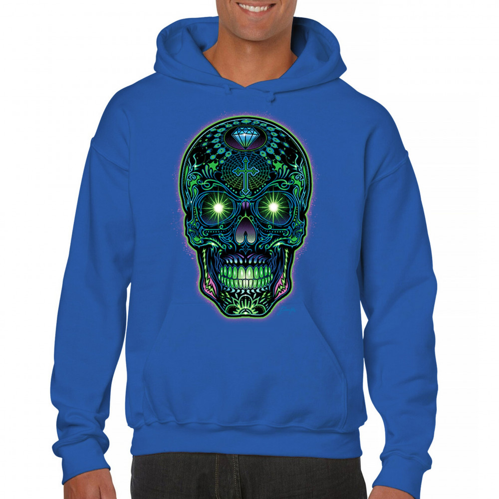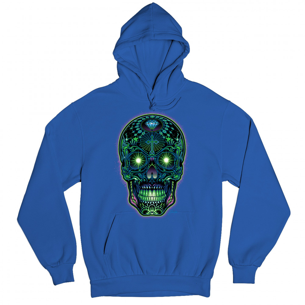 This electrified sugar skull design glows with neon energy and intricate details. Featuring green eyes, radiant cross, diamond, spider web, and vivid colors, it's a bold mash-up of psychedelic art, Day of the Dead tradition, and rave culture. A vibrant design perfect for skull fans and spiritual rebels alike.
