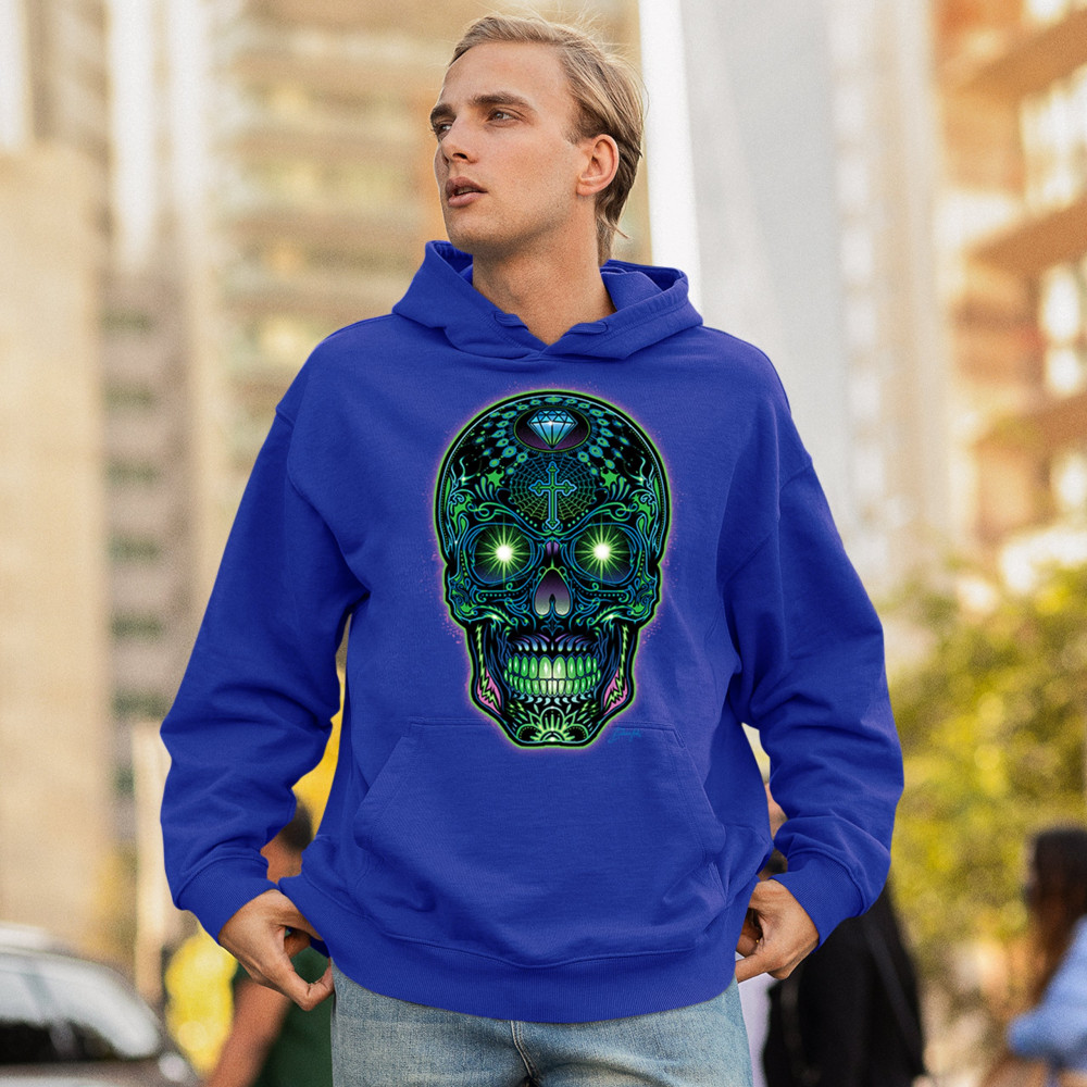 Electrified sugar skull with glowing green eyes, neon cross and diamond, perfect for rave lovers, skull art fans, and Day of the Dead style.
