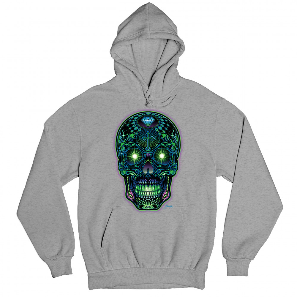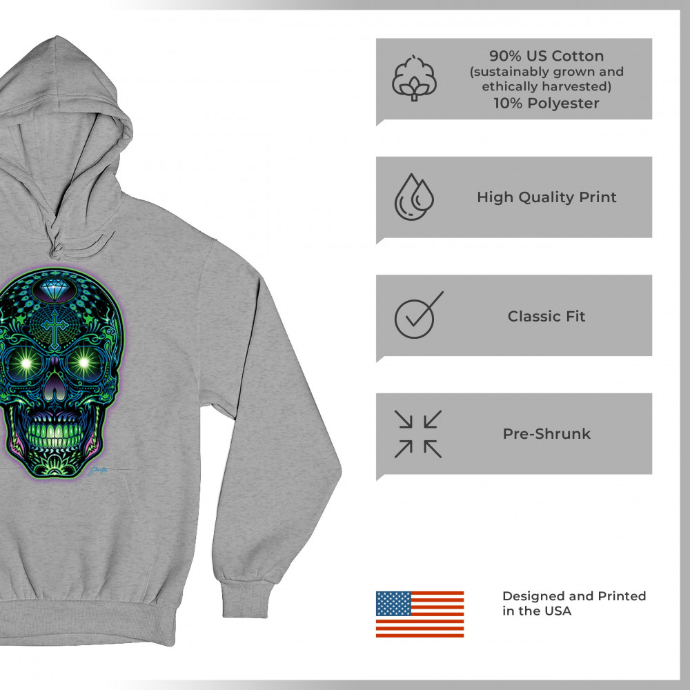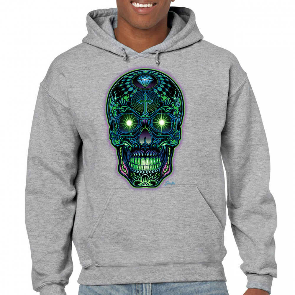 This electrified sugar skull design glows with neon energy and intricate details. Featuring green eyes, radiant cross, diamond, spider web, and vivid colors, it's a bold mash-up of psychedelic art, Day of the Dead tradition, and rave culture. A vibrant design perfect for skull fans and spiritual rebels alike.
