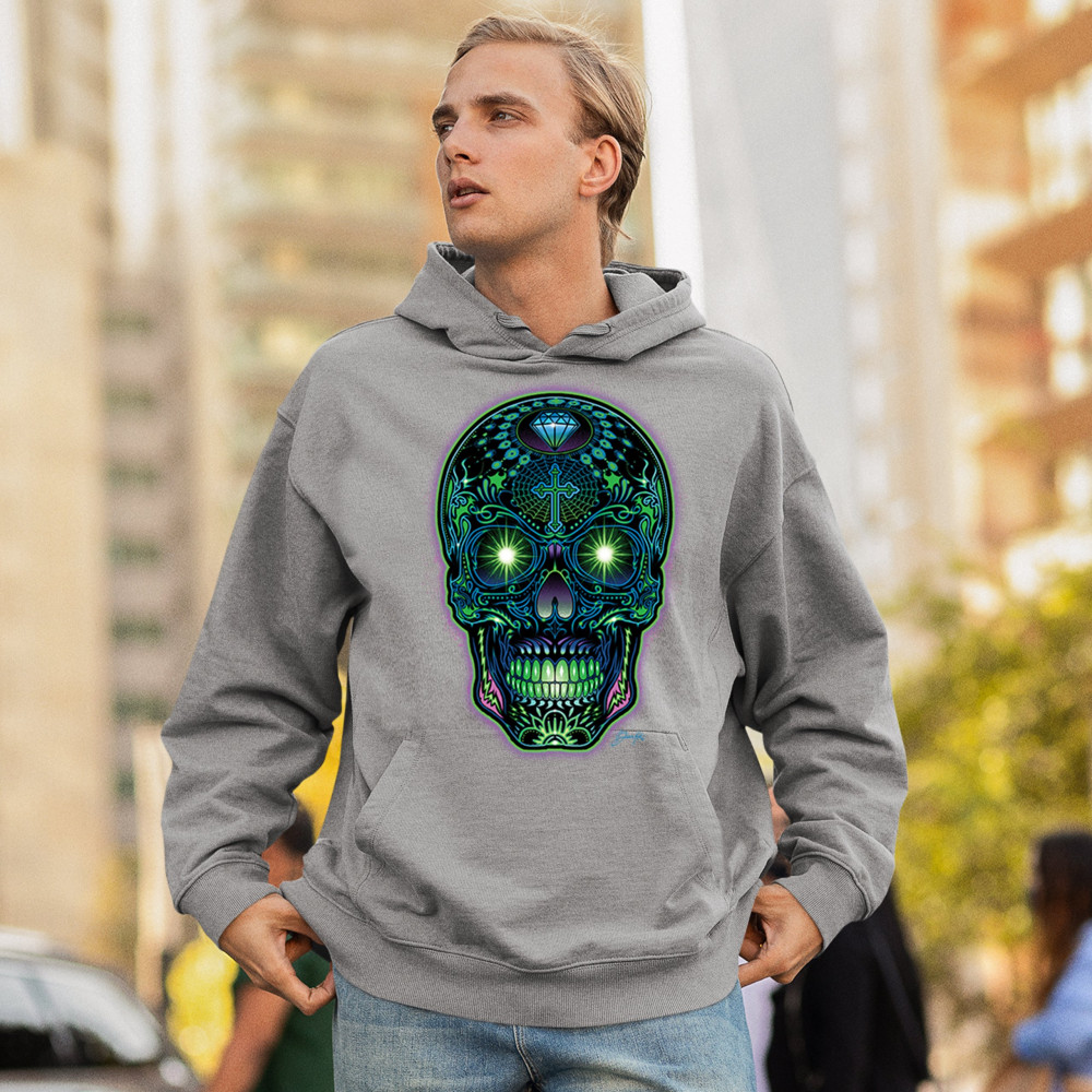 Electrified sugar skull with glowing green eyes, neon cross and diamond, perfect for rave lovers, skull art fans, and Day of the Dead style.