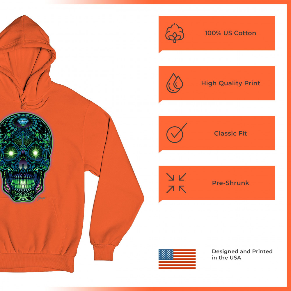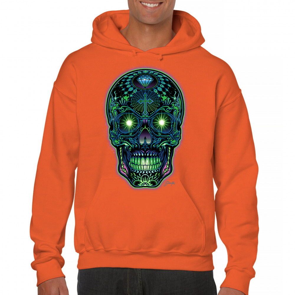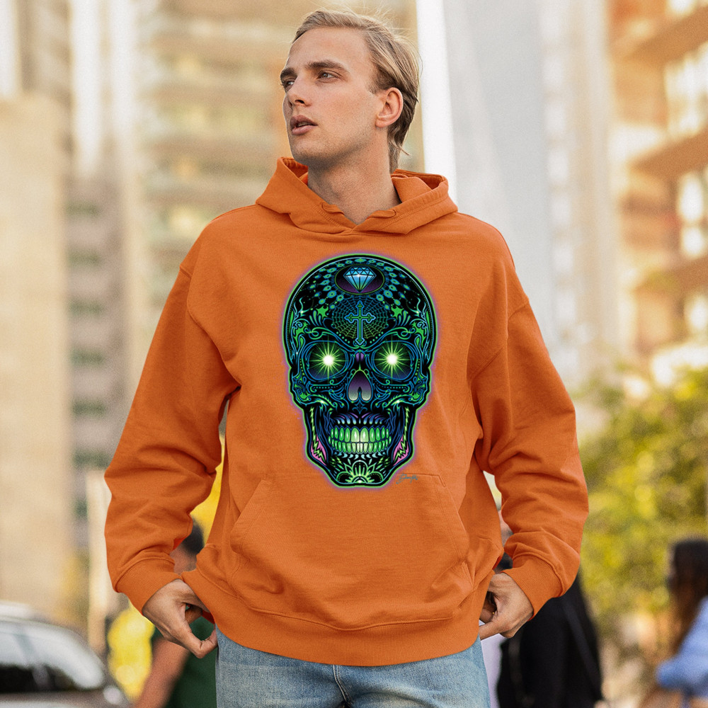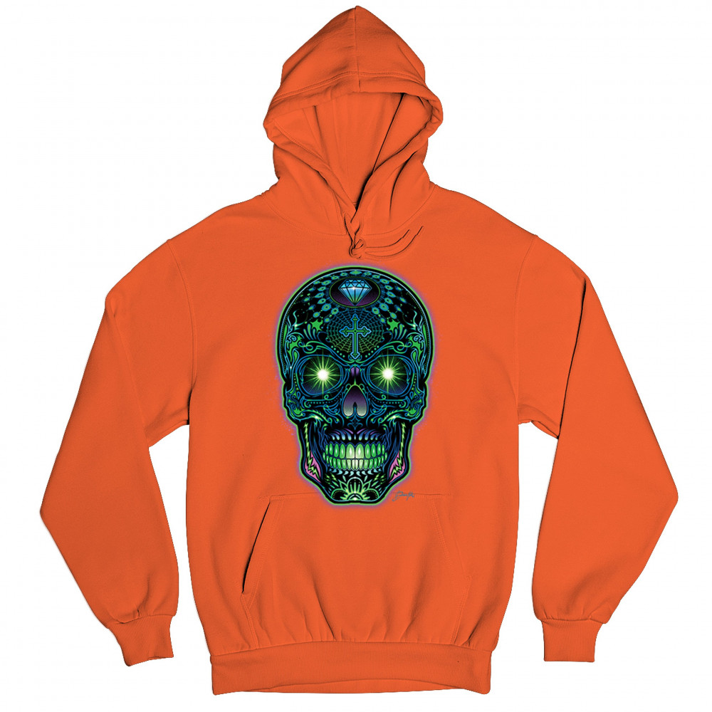 This electrified sugar skull design glows with neon energy and intricate details. Featuring green eyes, radiant cross, diamond, spider web, and vivid colors, it's a bold mash-up of psychedelic art, Day of the Dead tradition, and rave culture. A vibrant design perfect for skull fans and spiritual rebels alike.