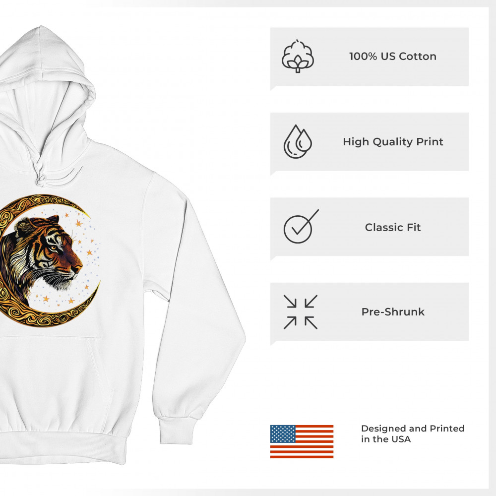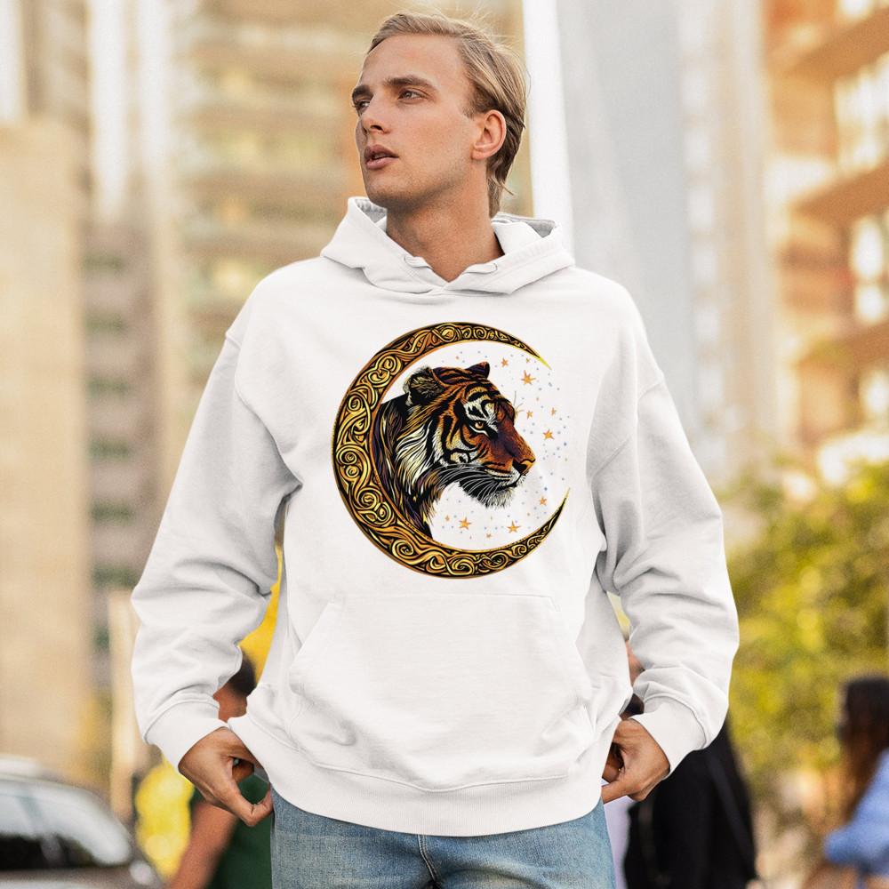 Bold tiger design in Celtic moon with cosmic sky. Symbol of strength, instinct, and jungle mysticism. Great for animal lovers and fantasy fans.