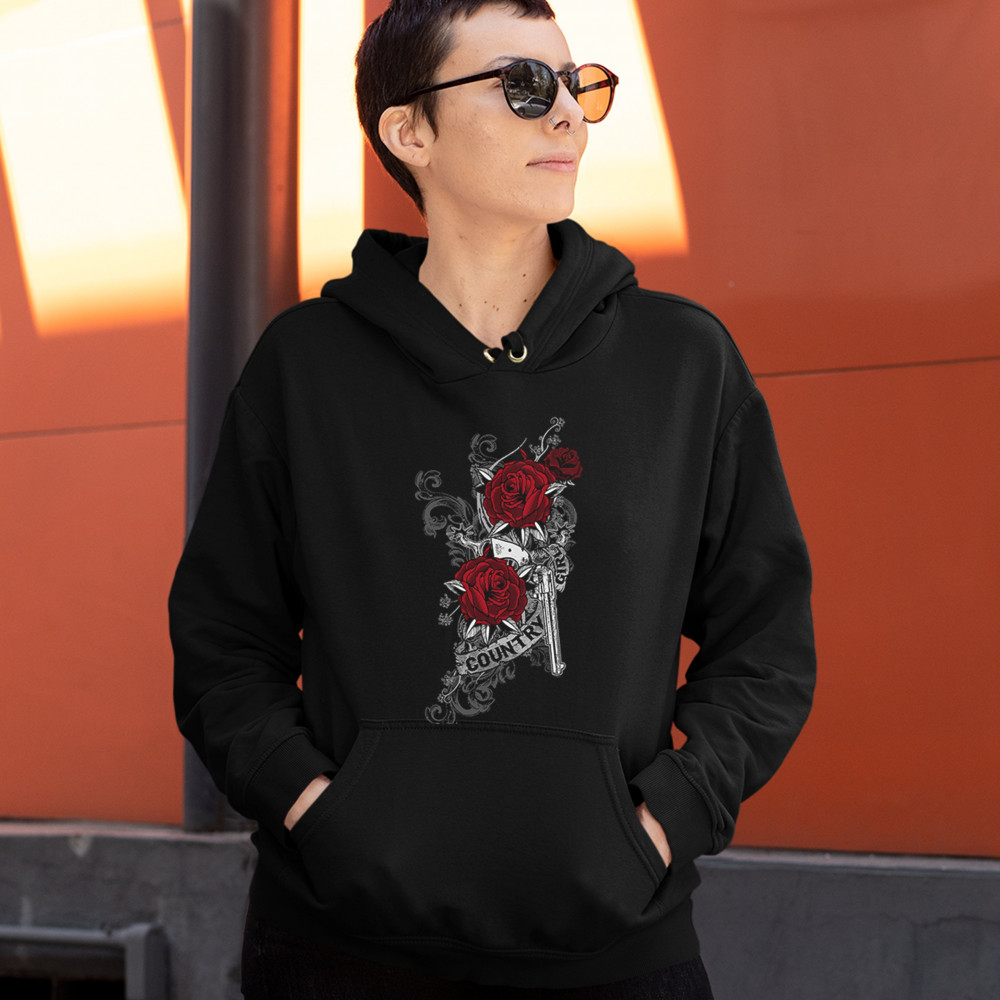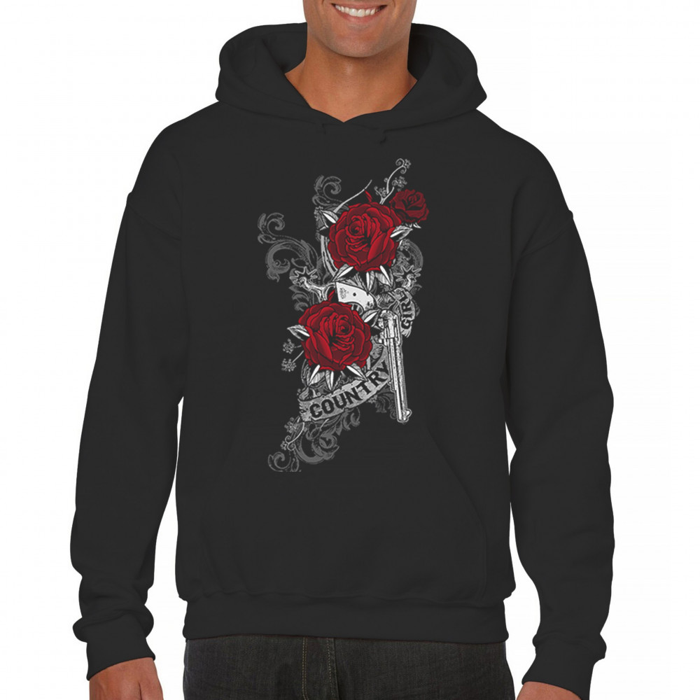 This western-inspired design features a silver revolver wrapped in deep red roses and scrolling filigree. A perfect balance of bold and beautiful, it’s ideal for country girls who ride strong, dress proud, and love a design that speaks to both grit and grace. Great for nights out, fairs, and rodeo weekends.
