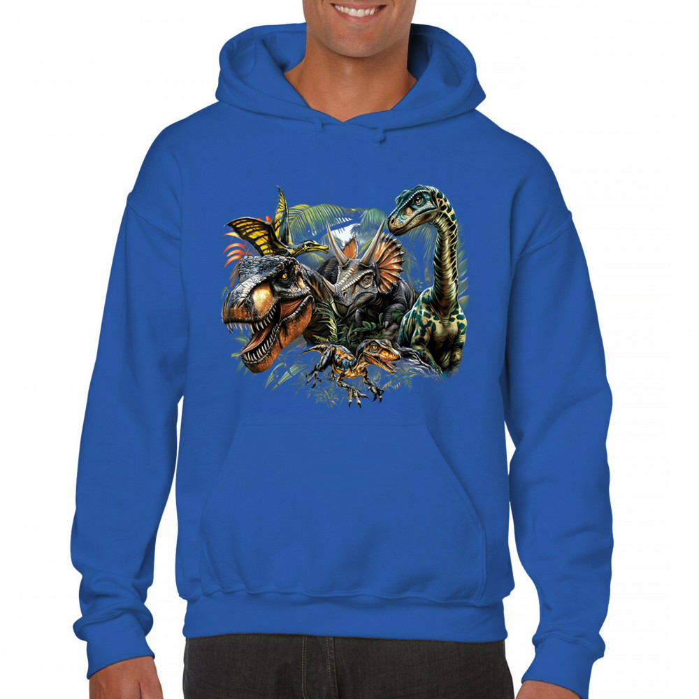 Get prehistoric with this electrifying design featuring a full dino squad in vibrant jungle detail. Includes t rex, triceratops, raptor, brachiosaurus, and pteranodon, all surrounded by tropical foliage. A perfect pick for dinosaur fans, fossil hunters, Jurassic birthday parties, or anyone who loves bold, wild, nature-themed art.