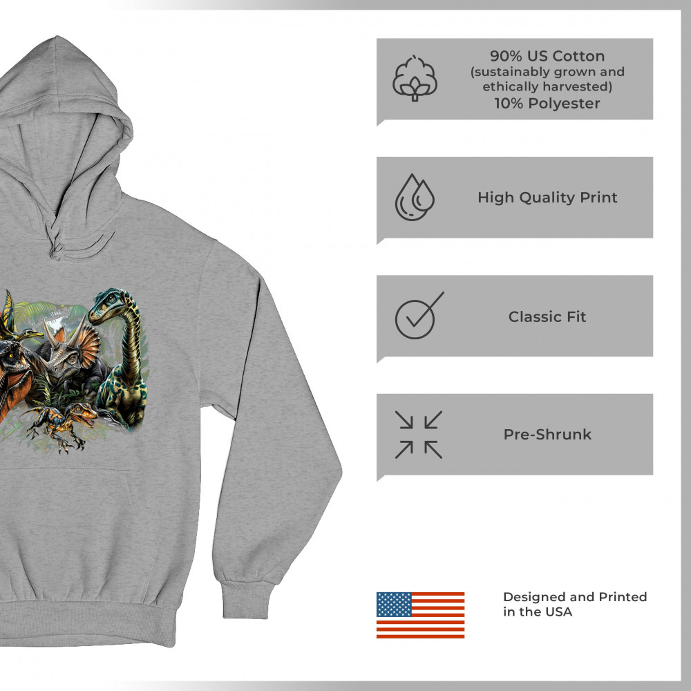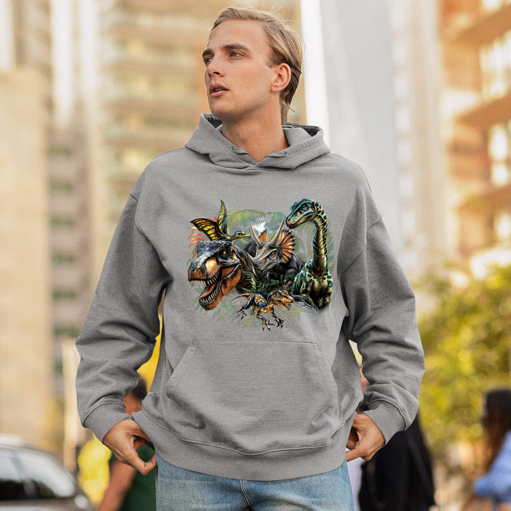 Get prehistoric with this electrifying design featuring a full dino squad in vibrant jungle detail. Includes t rex, triceratops, raptor, brachiosaurus, and pteranodon, all surrounded by tropical foliage. A perfect pick for dinosaur fans, fossil hunters, Jurassic birthday parties, or anyone who loves bold, wild, nature-themed art.