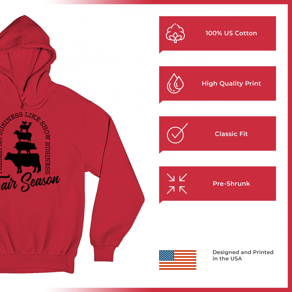 Embrace the spirit of fair season with our "Fair Season" design, ideal for anyone who loves farm animals and the excitement of fairs. Featuring silhouettes of a chicken, goat, sheep, and cow stacked together, this design brings a touch of whimsy and fun to any occasion. Perfect for 4-H members, farmers, and fair enthusiasts, it's a great way to express your love for agricultural fairs and farm life. This design makes an excellent gift, capturing the essence of show business and the joy of the fair season.