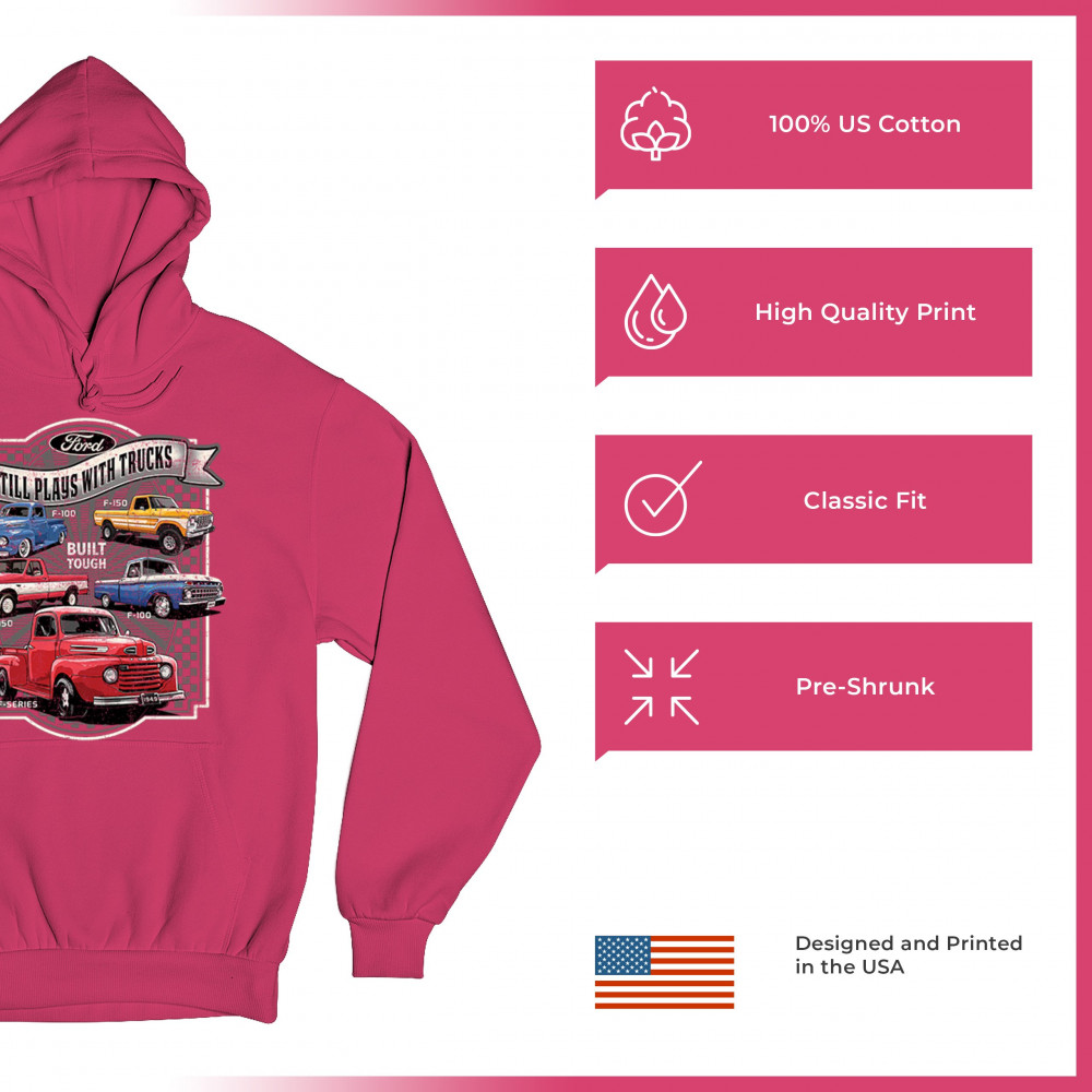 Features classic Ford F-Series trucks from 1949 to F-150. Great for vintage truck fans, garage wear, car shows, and collectors who love pickups.