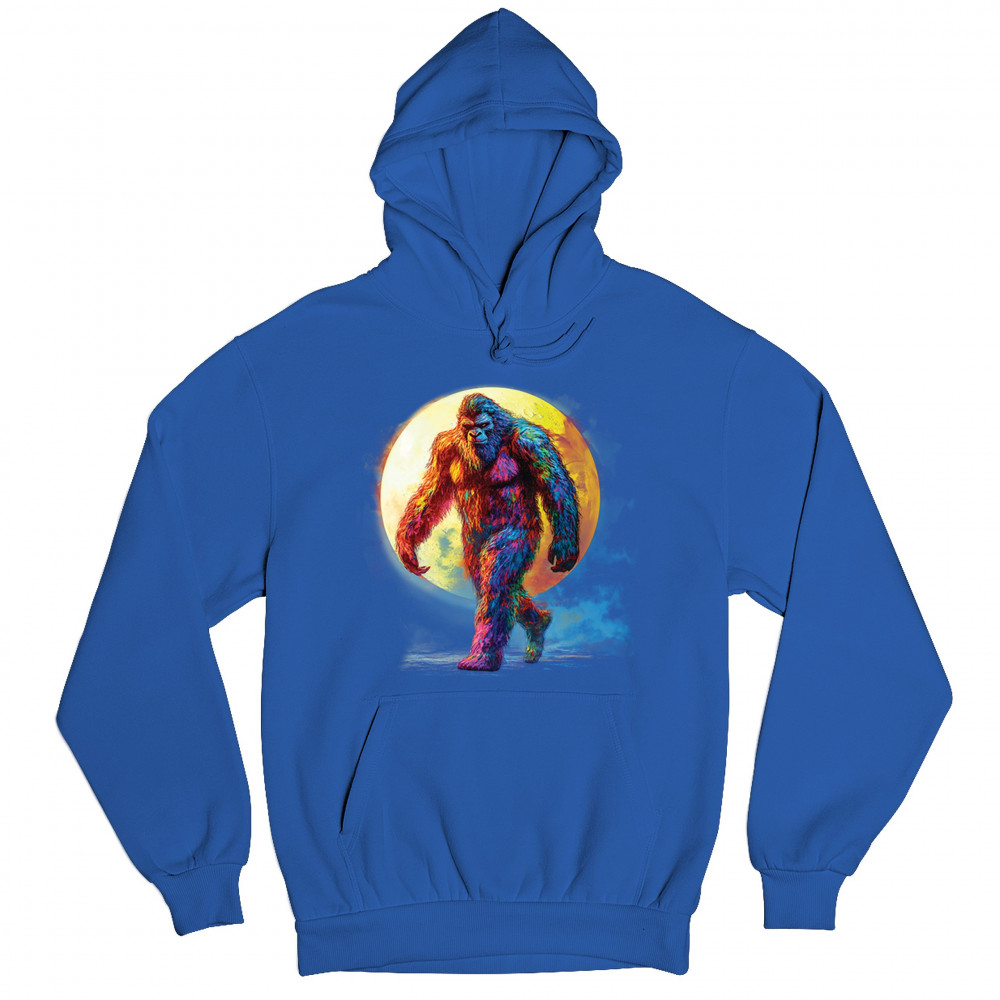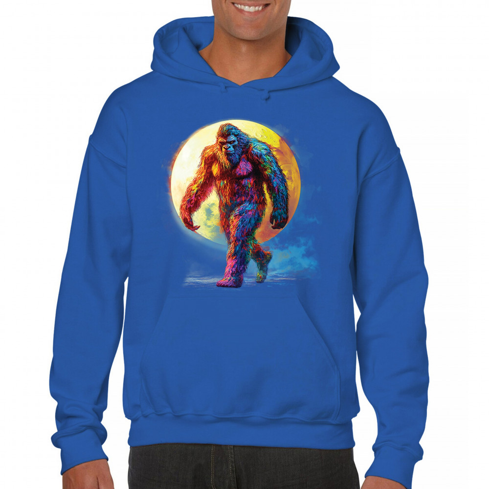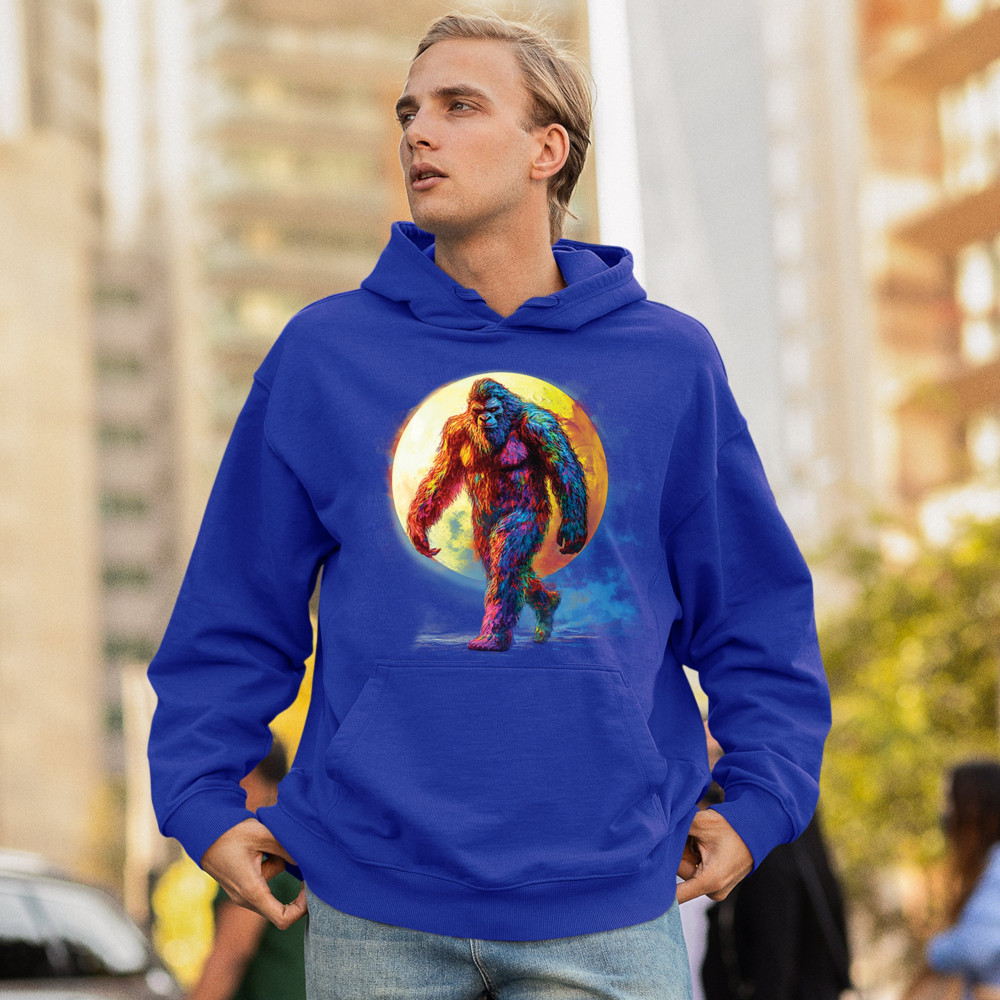 Rainbow Bigfoot under full moon design for cryptid lovers, festival goers, and psychedelic art fans. Bold, surreal, and eye-catching.