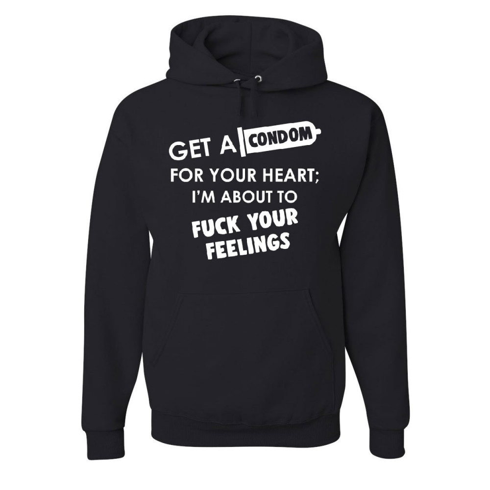 GET A CONDOM FOR YOUR HEART hoodie funny rude offensive humor sweatshirt black
