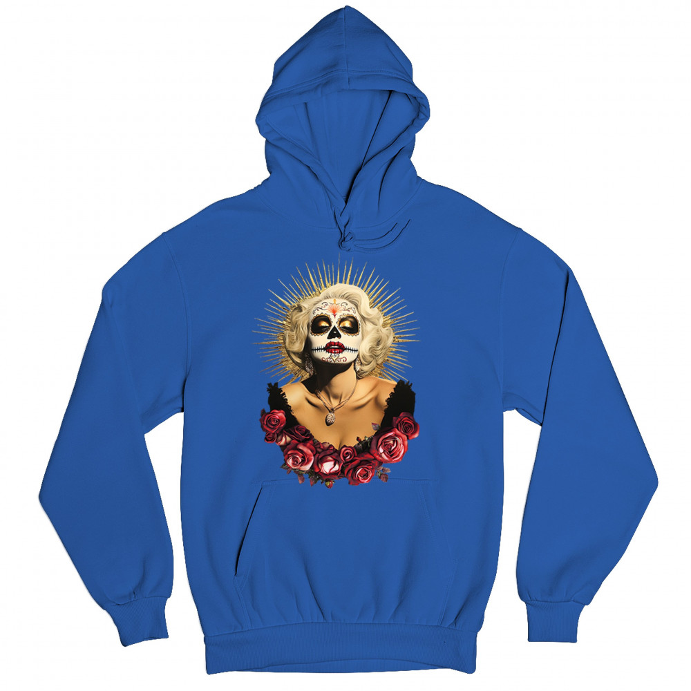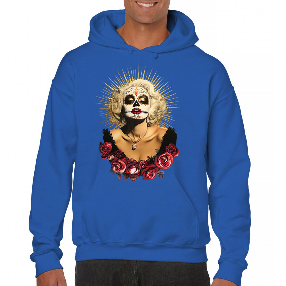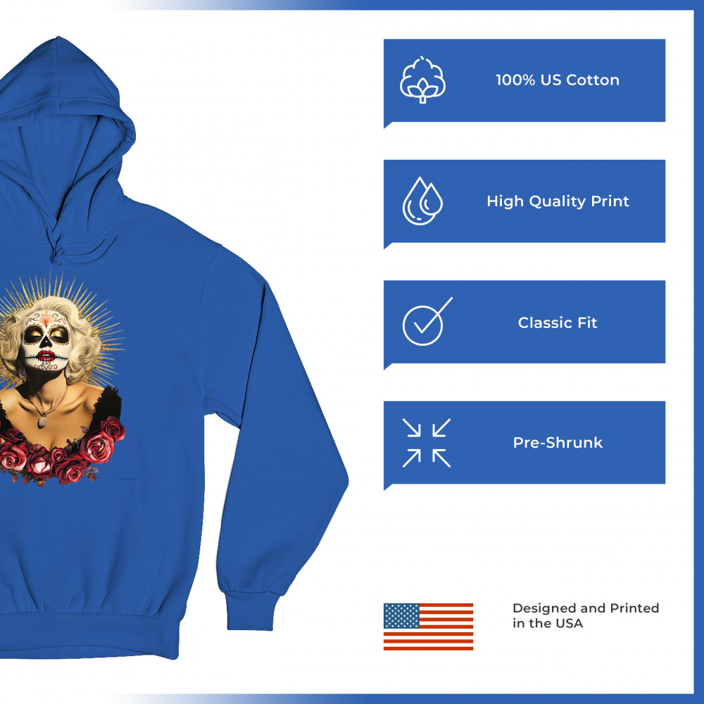This bold and beautiful sugar skull design features a glamorous calavera woman crowned in a golden halo and framed by roses. A divine tribute to Dia de los Muertos, this look blends vintage glam, Latin culture, makeup artistry, and sacred symbolism. Perfect for fans of gothic beauty, Halloween, and heritage expression.