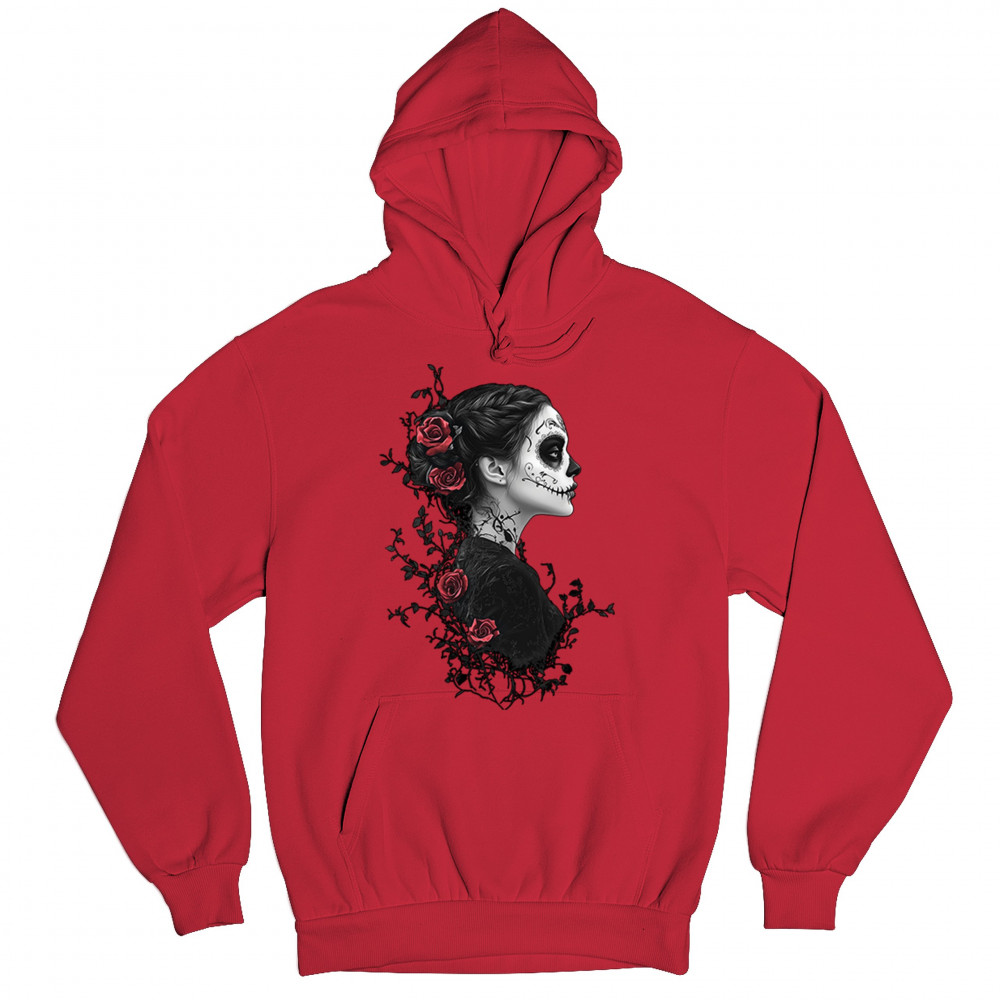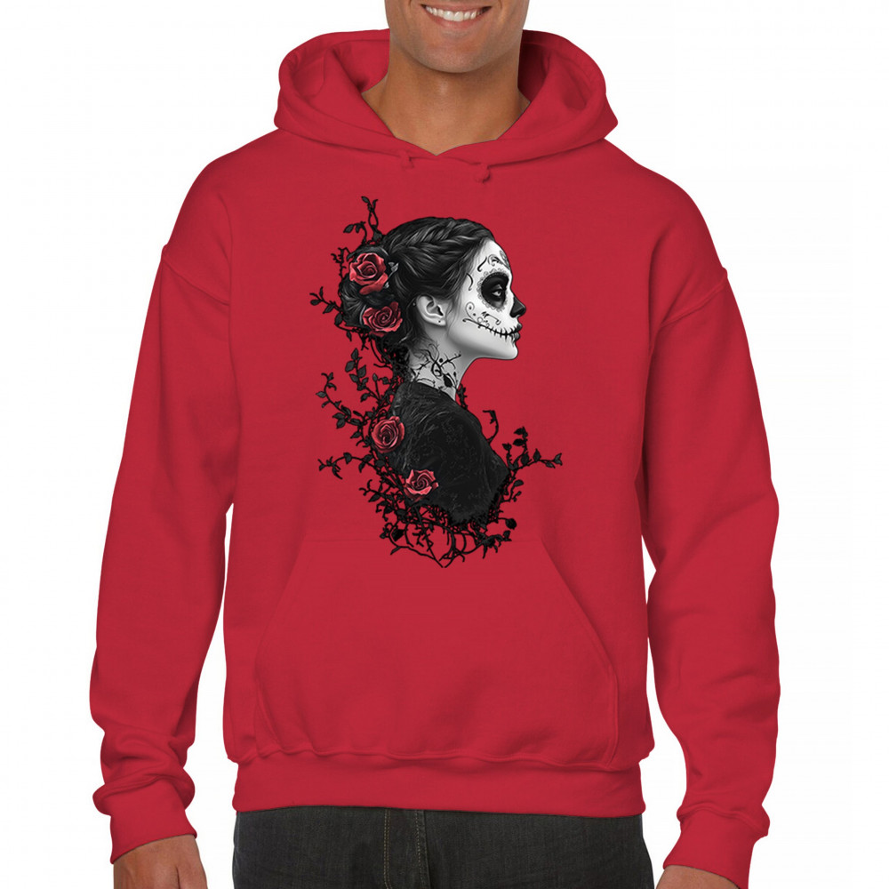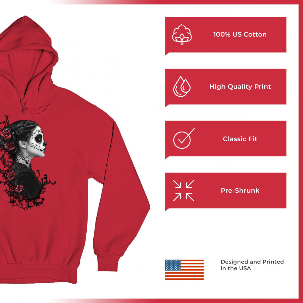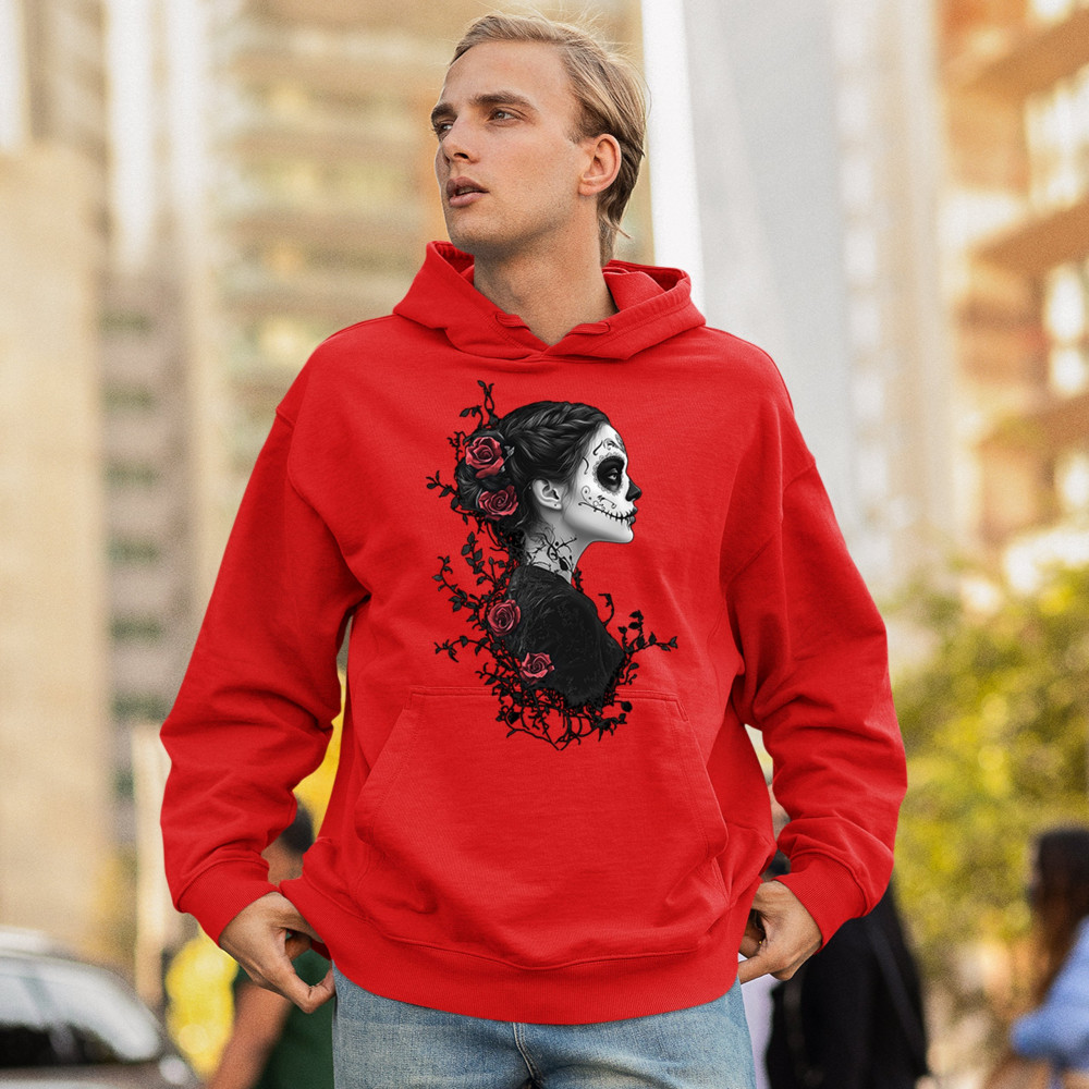 Celebrate Dia de los Muertos in style with this refined sugar skull woman design. Featuring a side profile view, vibrant red roses, and dark gothic floral elements, it creates a graceful balance between mystery and beauty. Ideal for fans of macabre art, skull themes, and honoring ancestral traditions through elegant visuals.