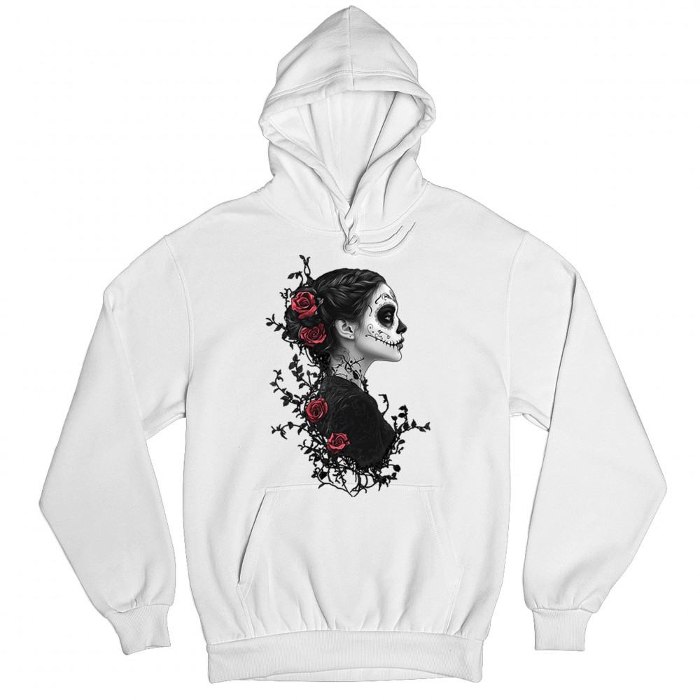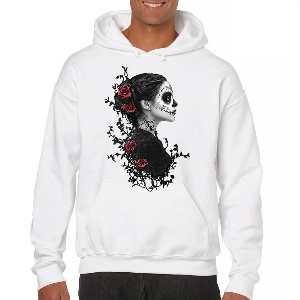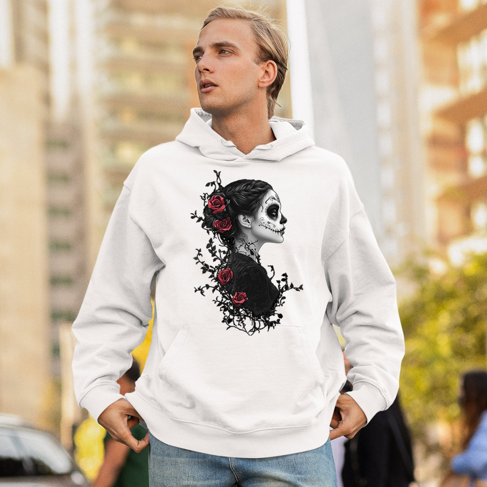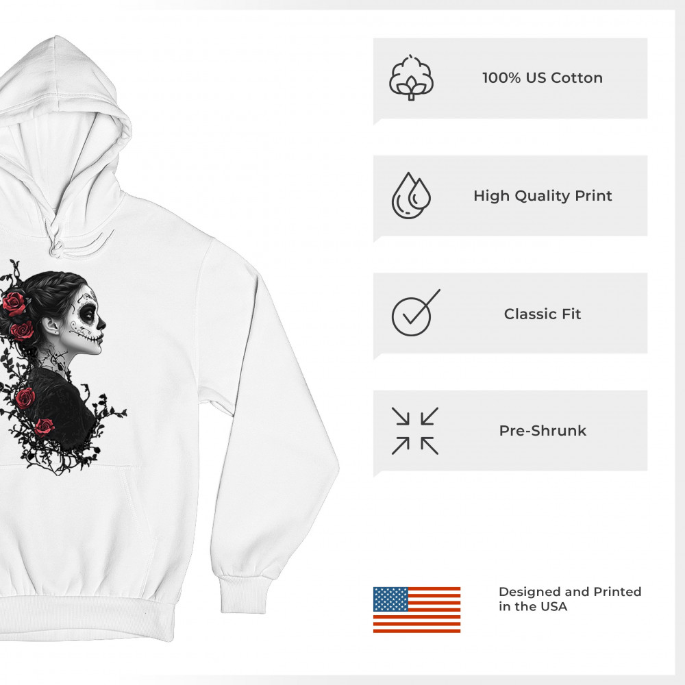 Celebrate Dia de los Muertos in style with this refined sugar skull woman design. Featuring a side profile view, vibrant red roses, and dark gothic floral elements, it creates a graceful balance between mystery and beauty. Ideal for fans of macabre art, skull themes, and honoring ancestral traditions through elegant visuals.