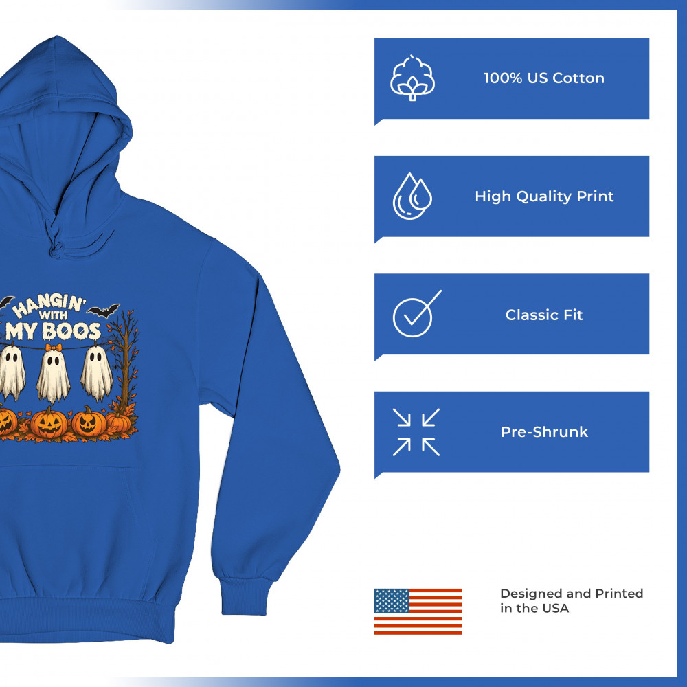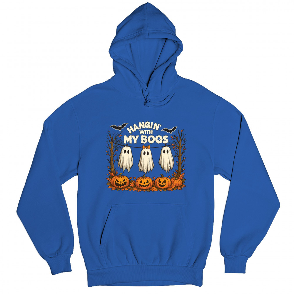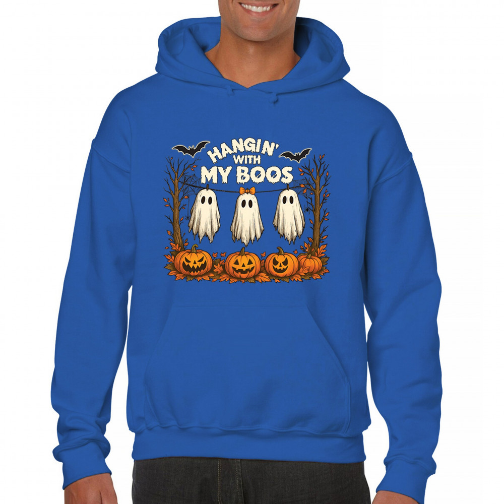 Hangin With My Boos design featuring spooky ghosts, jack o lanterns, and haunted house humor. Perfect for Halloween night, October 31, and parties.