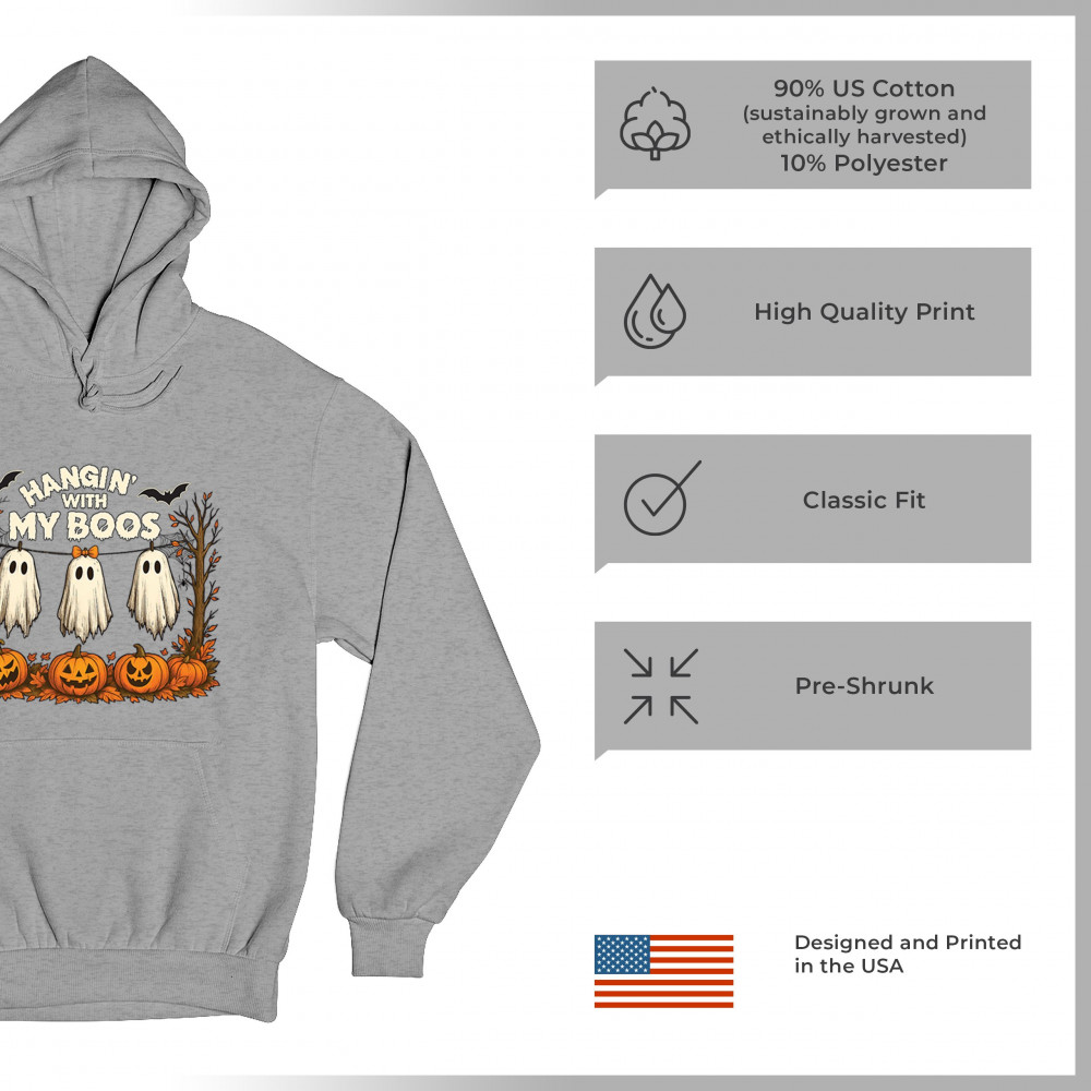 Hangin With My Boos design featuring spooky ghosts, jack o lanterns, and haunted house humor. Perfect for Halloween night, October 31, and parties.