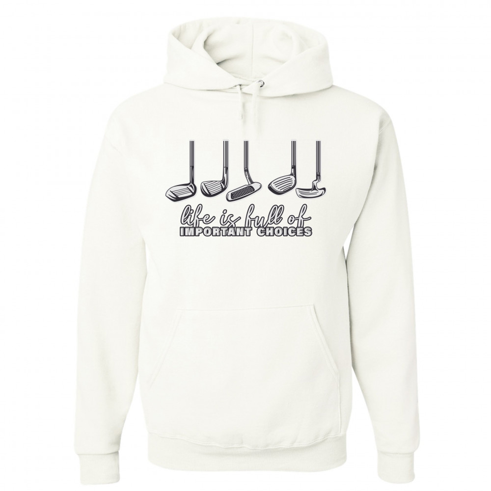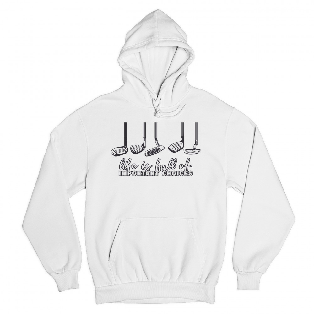 LIFE IS FULL OF IMPORTANT CHOICES sweatshirt funny golf clubs golfing hoodie white
