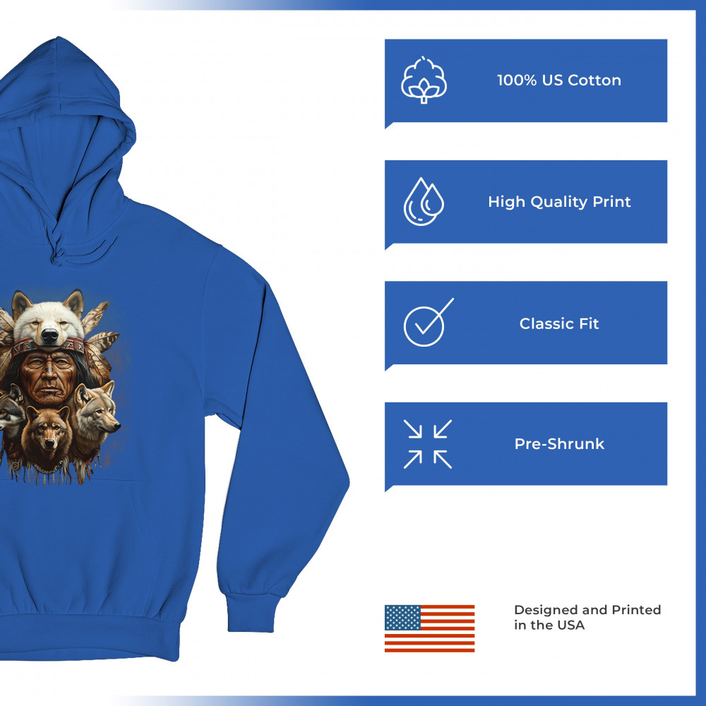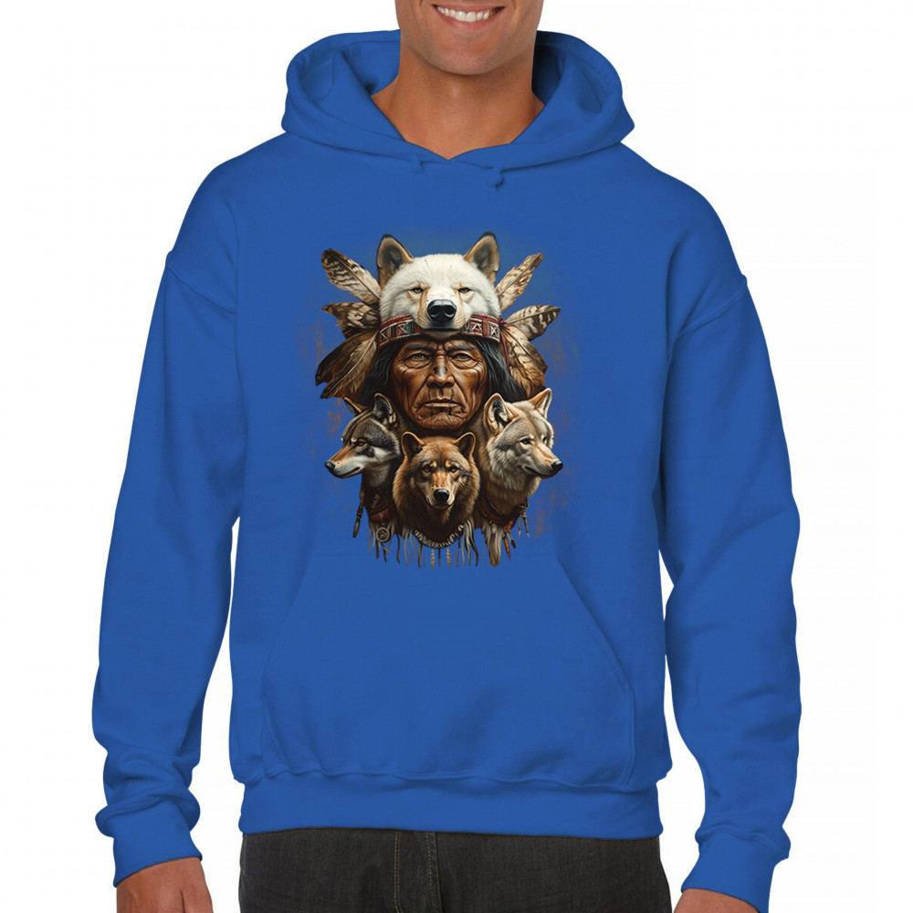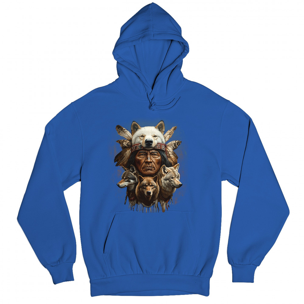NATIVE AMERICAN WOLF CHIEF sweatshirt headdress warrior wolves totem hoodie royal blue