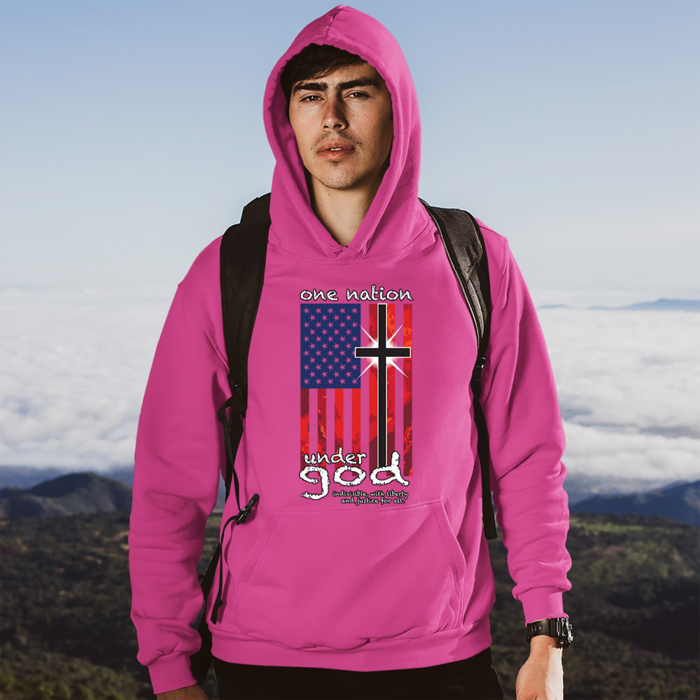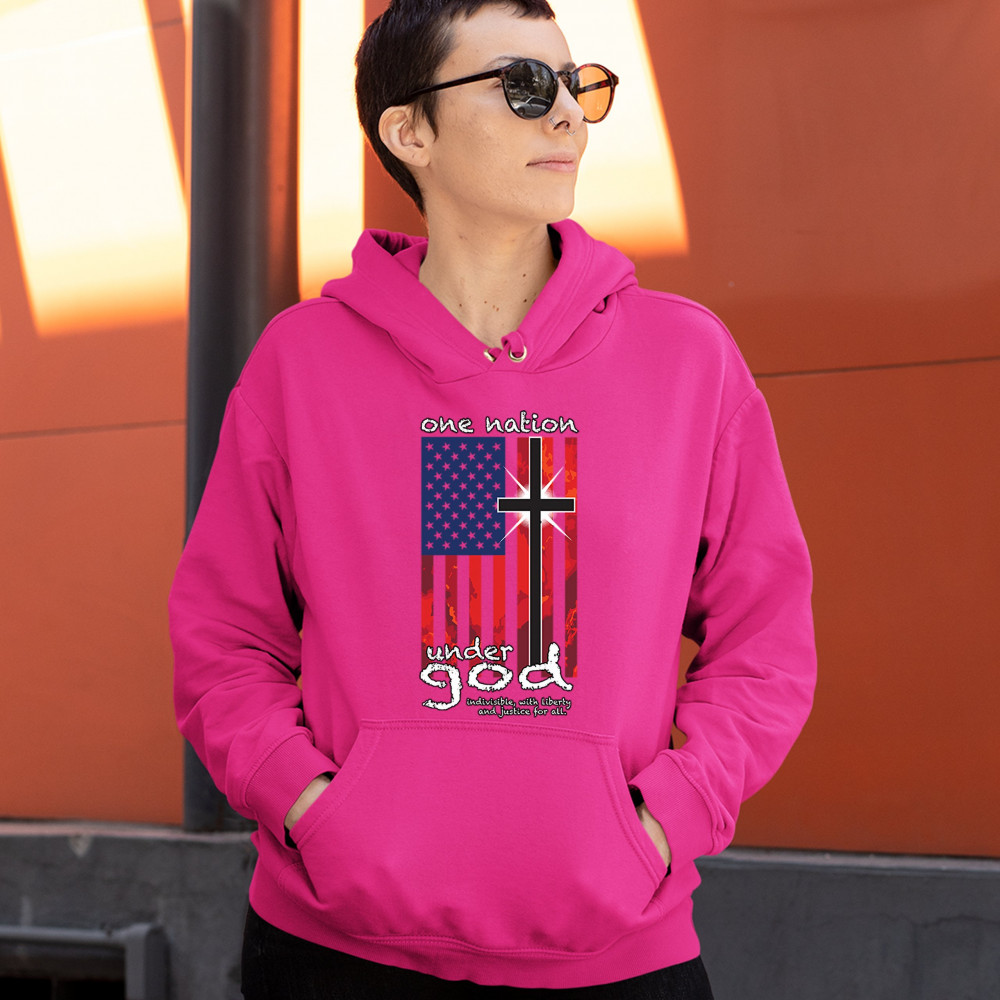 A patriotic print saying "One Nation Under God Indivisible, with Liberty and Justice for All" and featuring an American Flag with a cross instead of one of the stripes. Great choice for a religious person to wear on Independence Day or any other patriotic