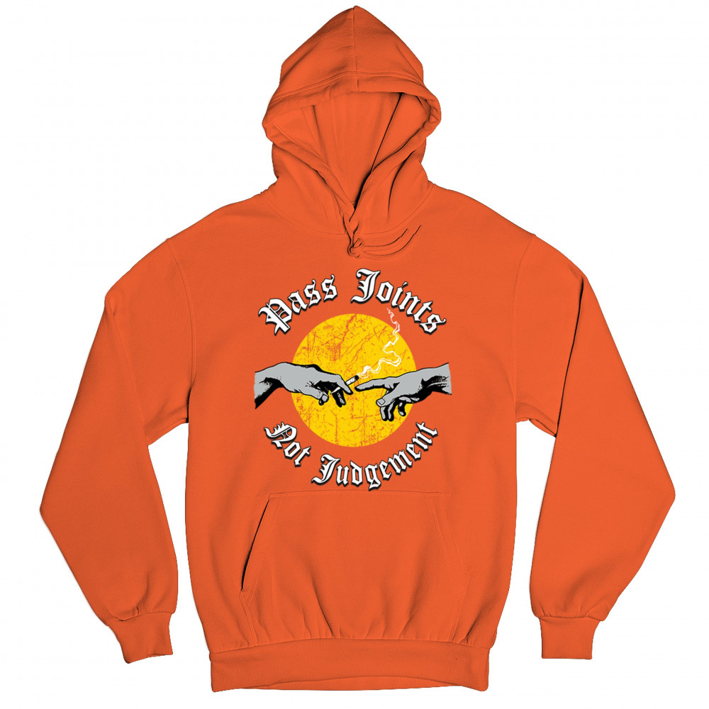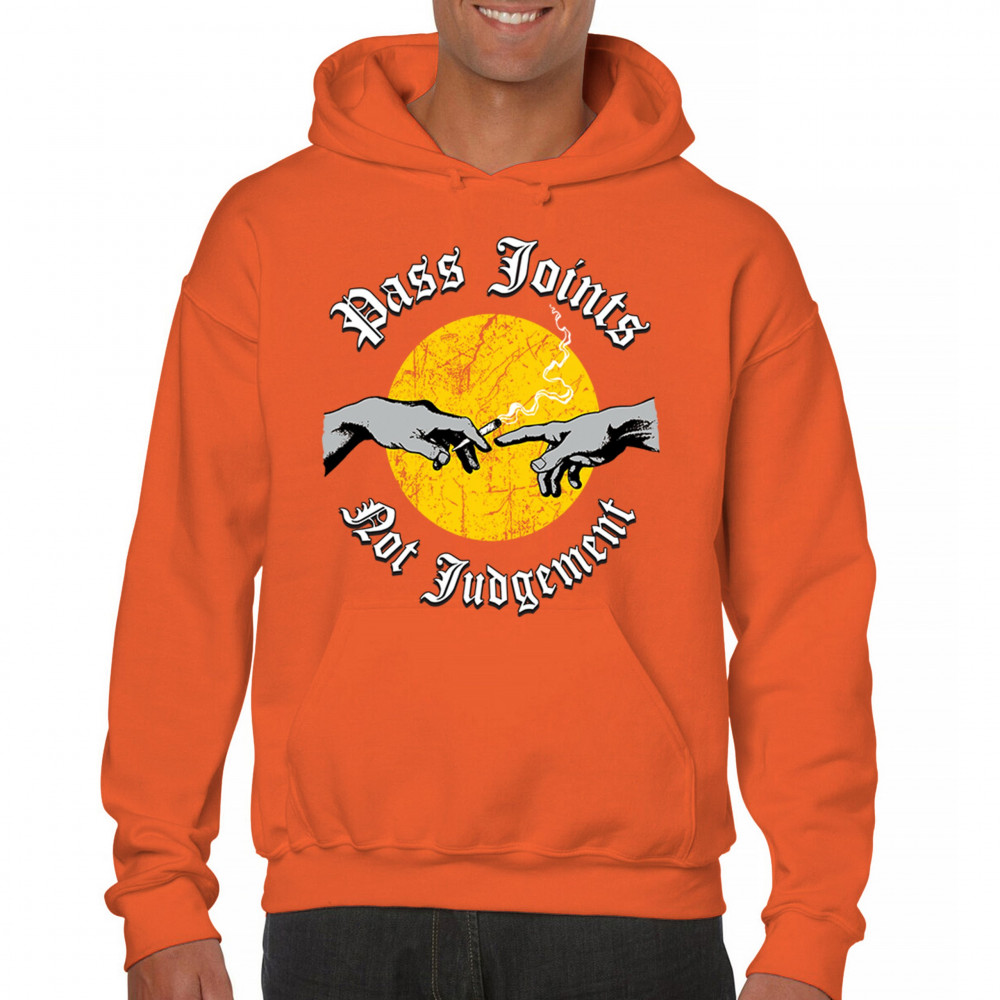 Cannabis culture twist on classic art. Hands passing a joint with “Pass Joints Not Judgement†message. Chill, bold, and unapologetically stoner.