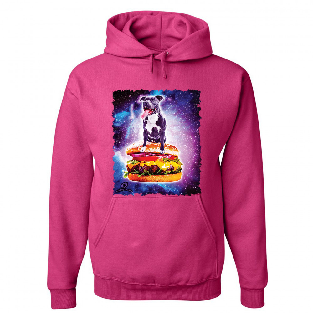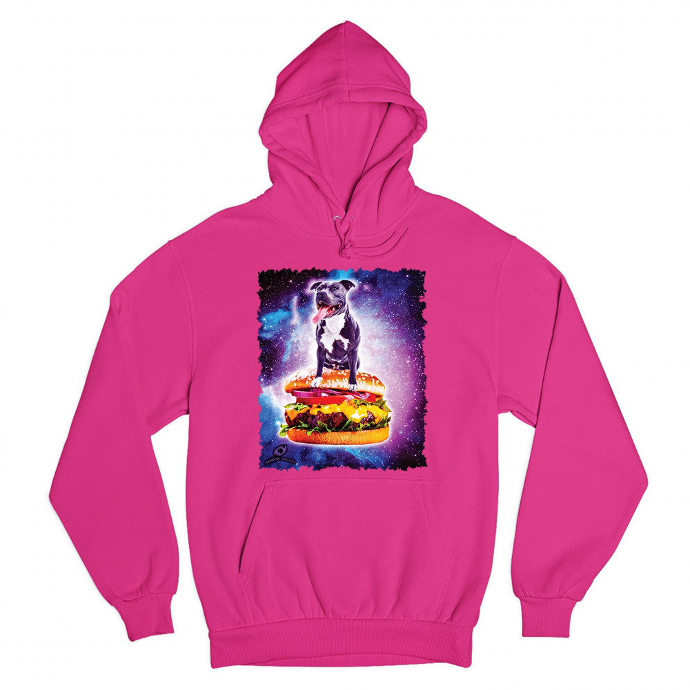 PIT BULL RIDING A BURGER FLYING THROUGH GALAXY sweatshirt funny pet hoodie pink