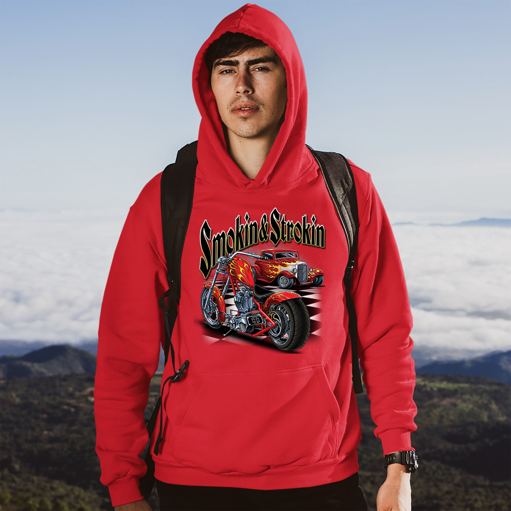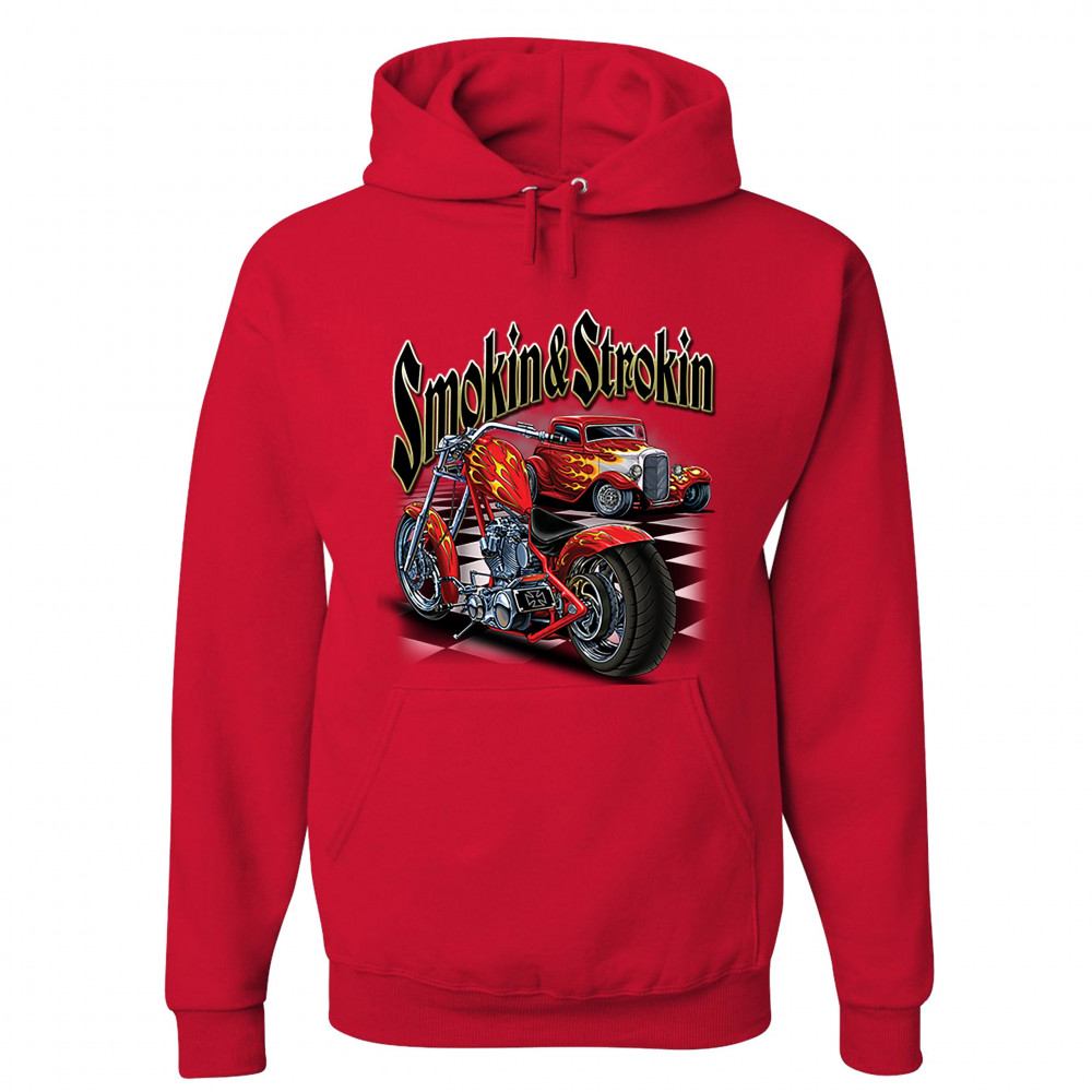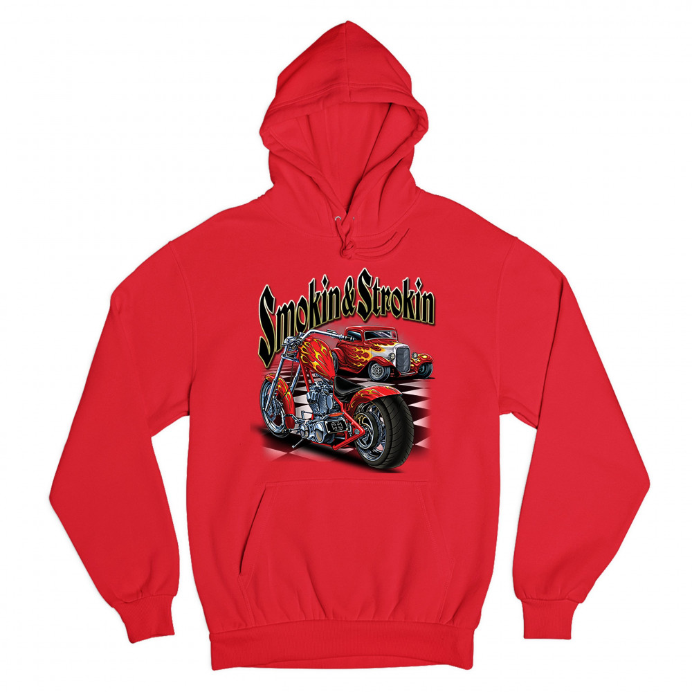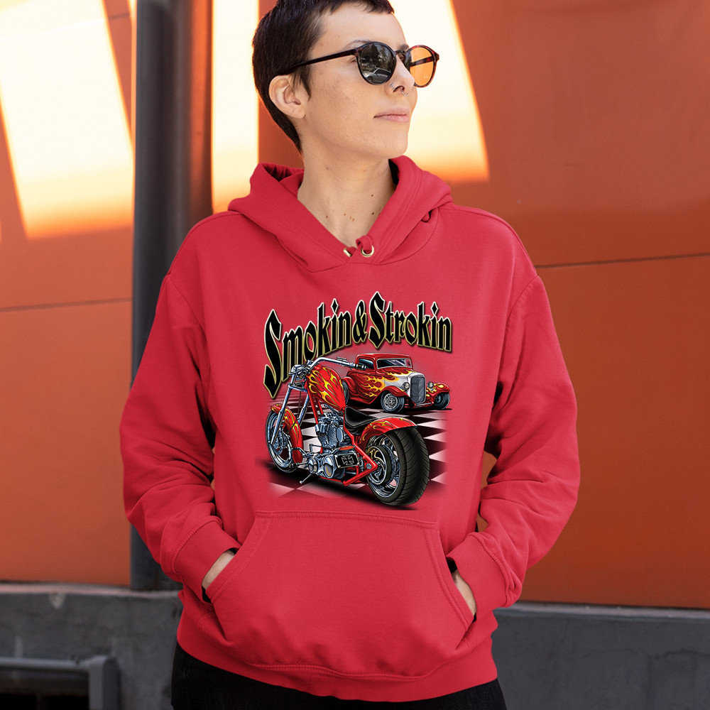 A print featuring a hot rod and a chopper motorcycle standing on a chess board, both covered with flame paint jobs. The print says: "Smoking & Strokin". A great choice for a fan of customized American classic cars, hot rods and motorcycles.