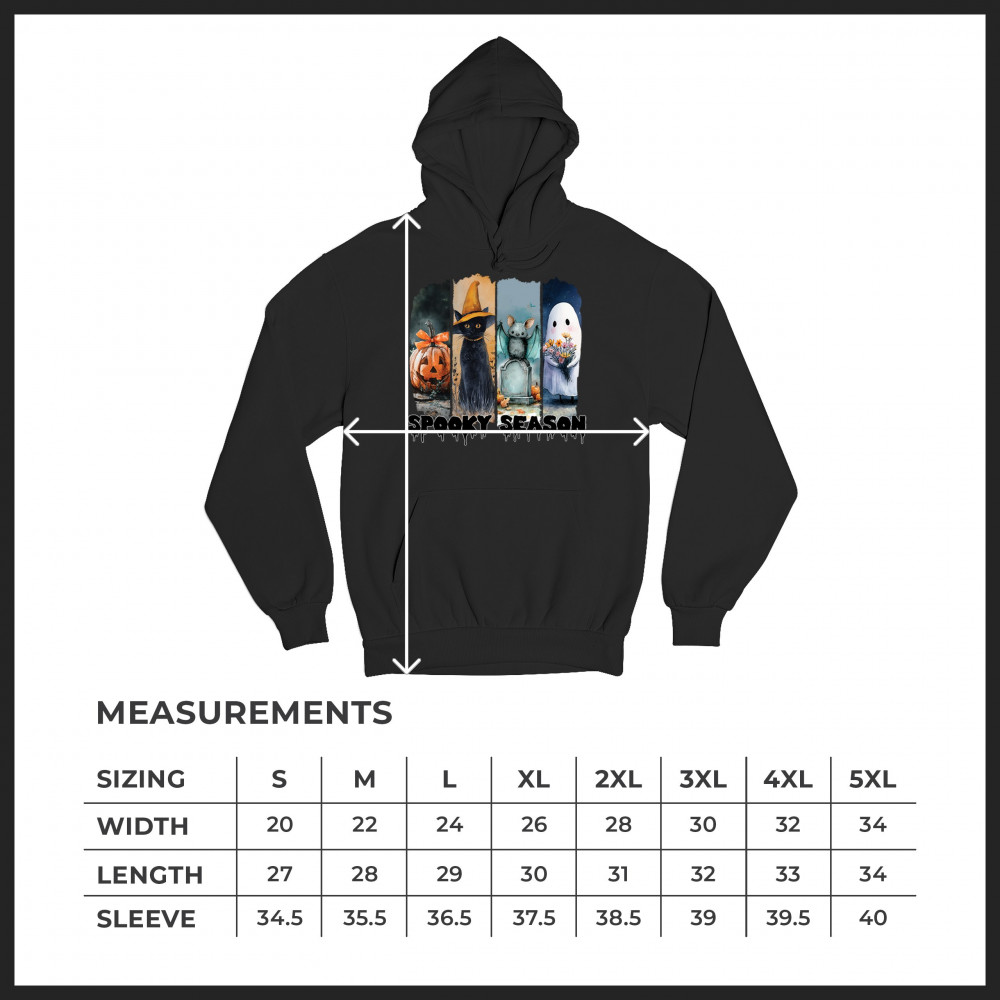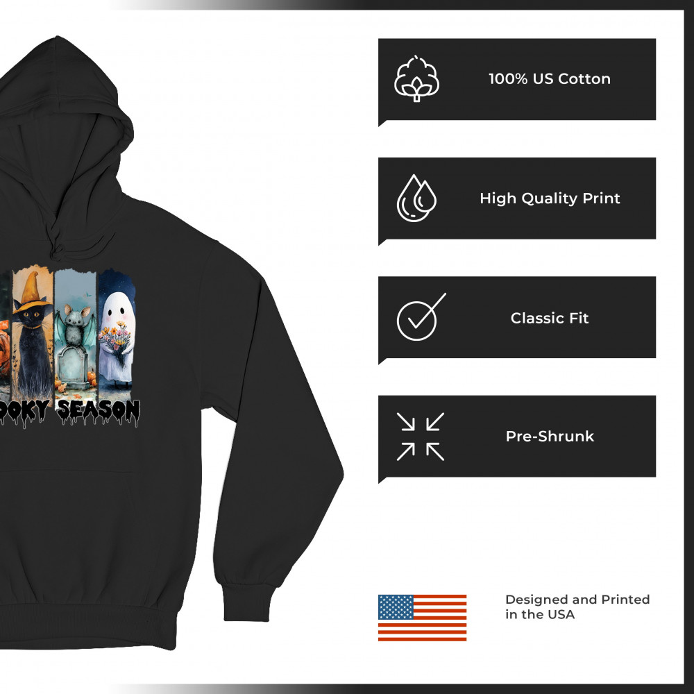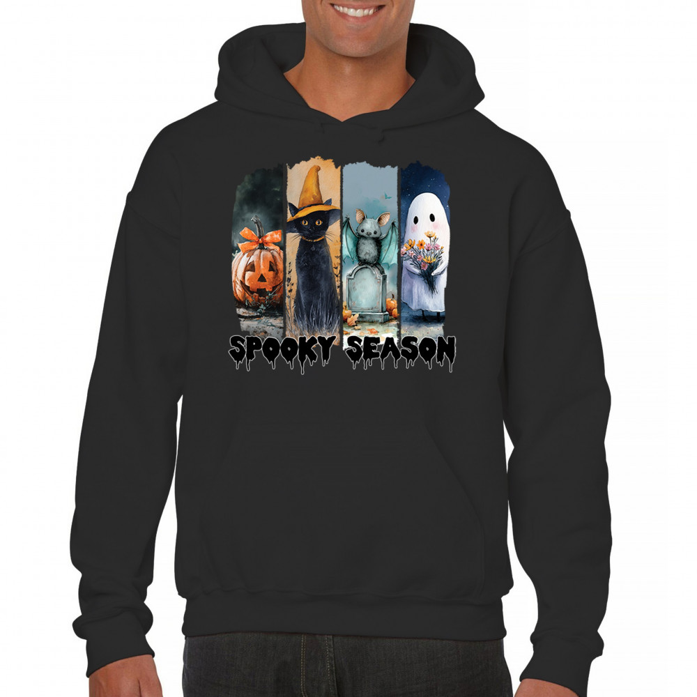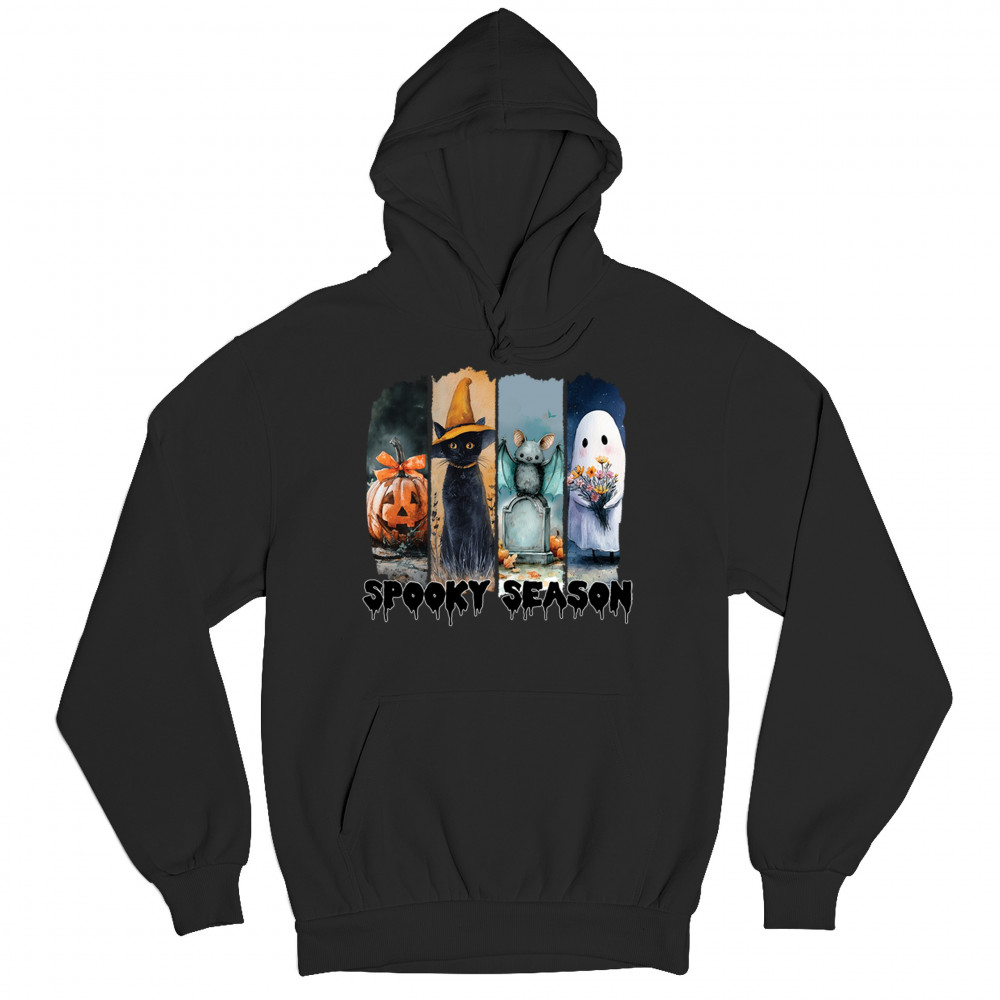 Spooky Season design with scary black cat, jack o lantern, haunted ghost house, and cute ghost. Perfect for October 31, trick or treat, and fall fun.