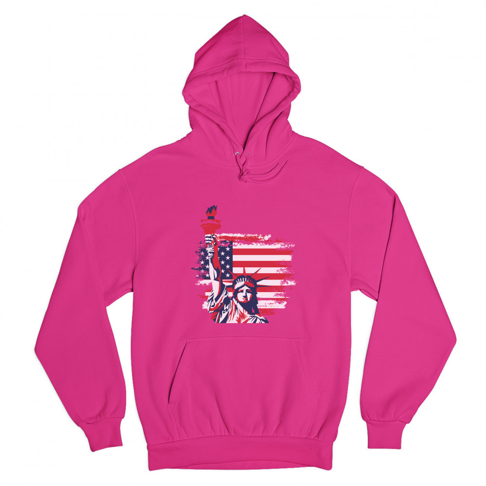 A patriotic print featuring a dripping silhouette of a bald eagle. The body is painted blue with lots of stars on it and the feathers of the wings, painted red, resemble the stripes of the American Flag. Over the wings there is a text written: "Land of the free home of the brave". Great choice to wear on Independence Day or any other patriotic holiday.