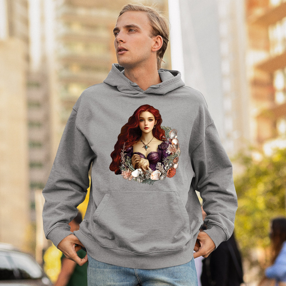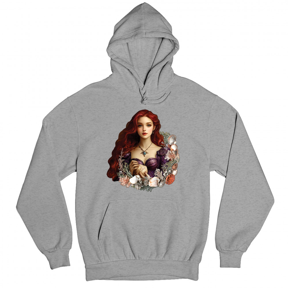 Inspired by mystical ocean themes, this design features a fantasy red-haired girl in a seashell dress, cradling a large shell. She is framed by coral, seaweed, and a shimmering array of ocean shells. With nods to classic mermaid lore and fairytale storytelling, it's perfect for fans of fantasy creatures, marine magic, and romantic ocean legends.