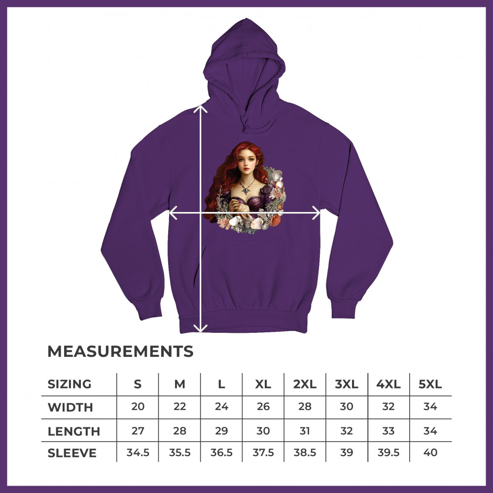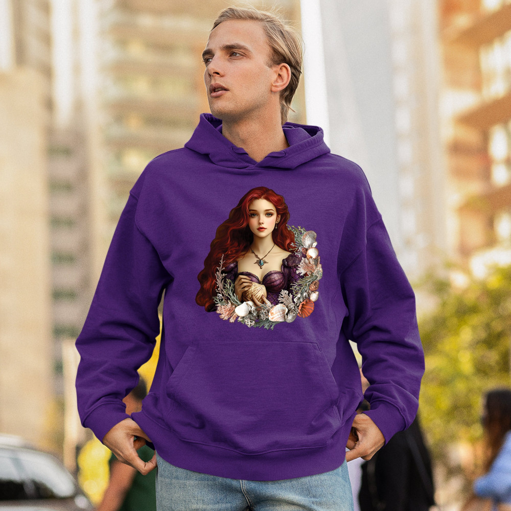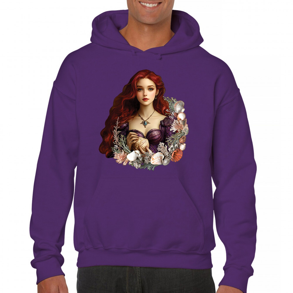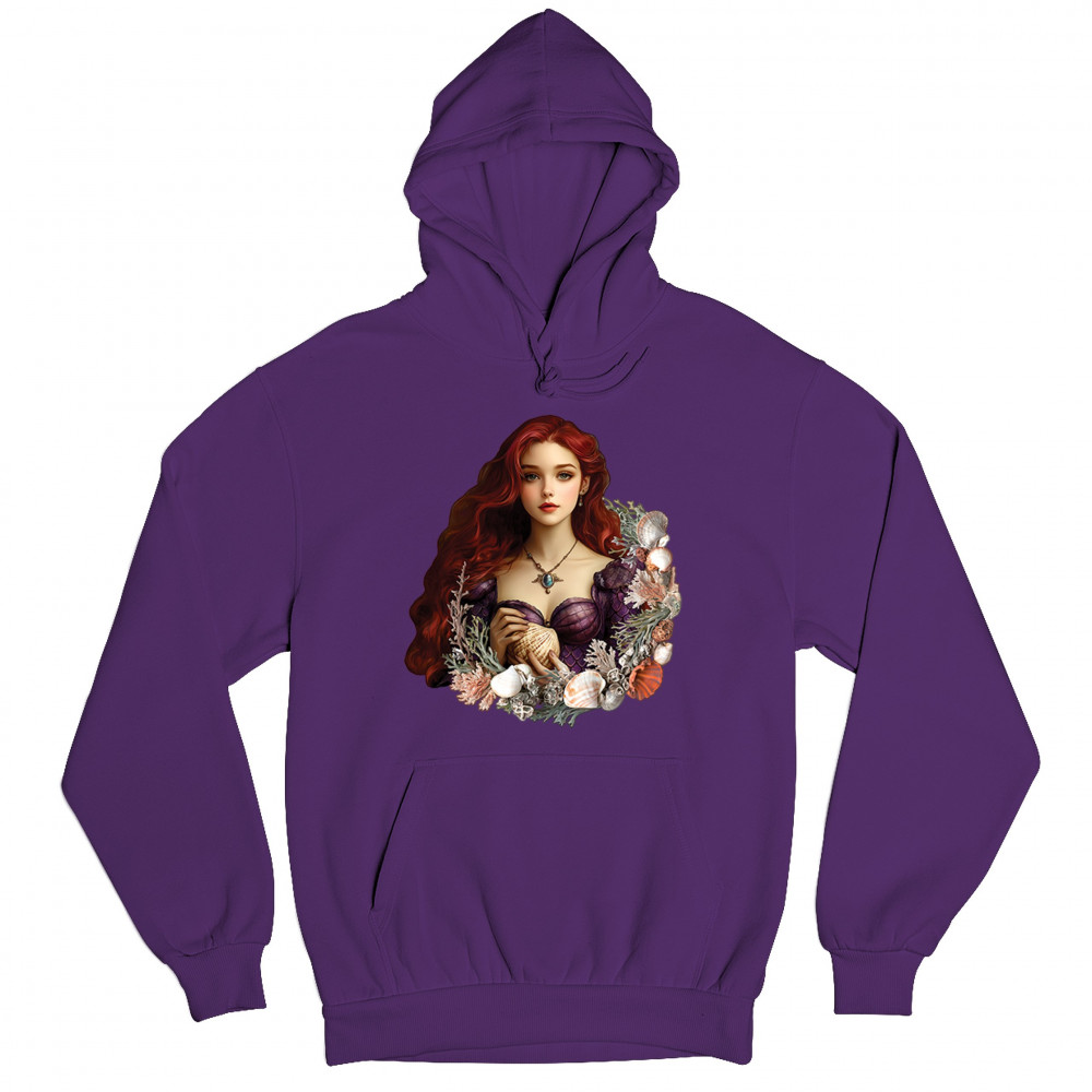 Inspired by mystical ocean themes, this design features a fantasy red-haired girl in a seashell dress, cradling a large shell. She is framed by coral, seaweed, and a shimmering array of ocean shells. With nods to classic mermaid lore and fairytale storytelling, it's perfect for fans of fantasy creatures, marine magic, and romantic ocean legends.