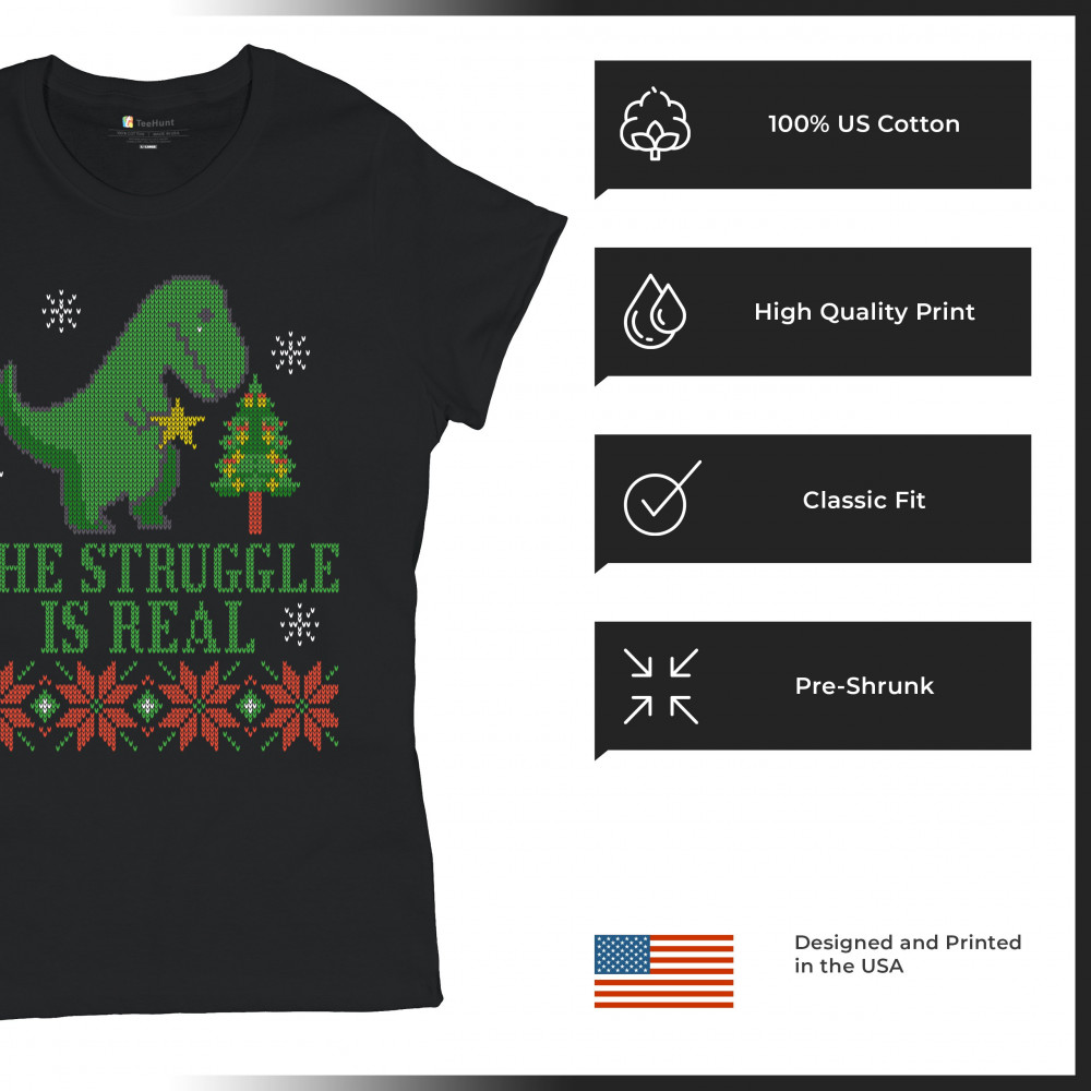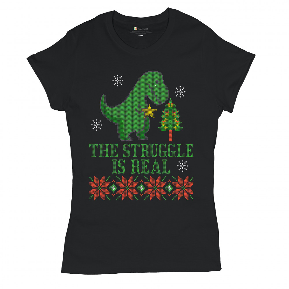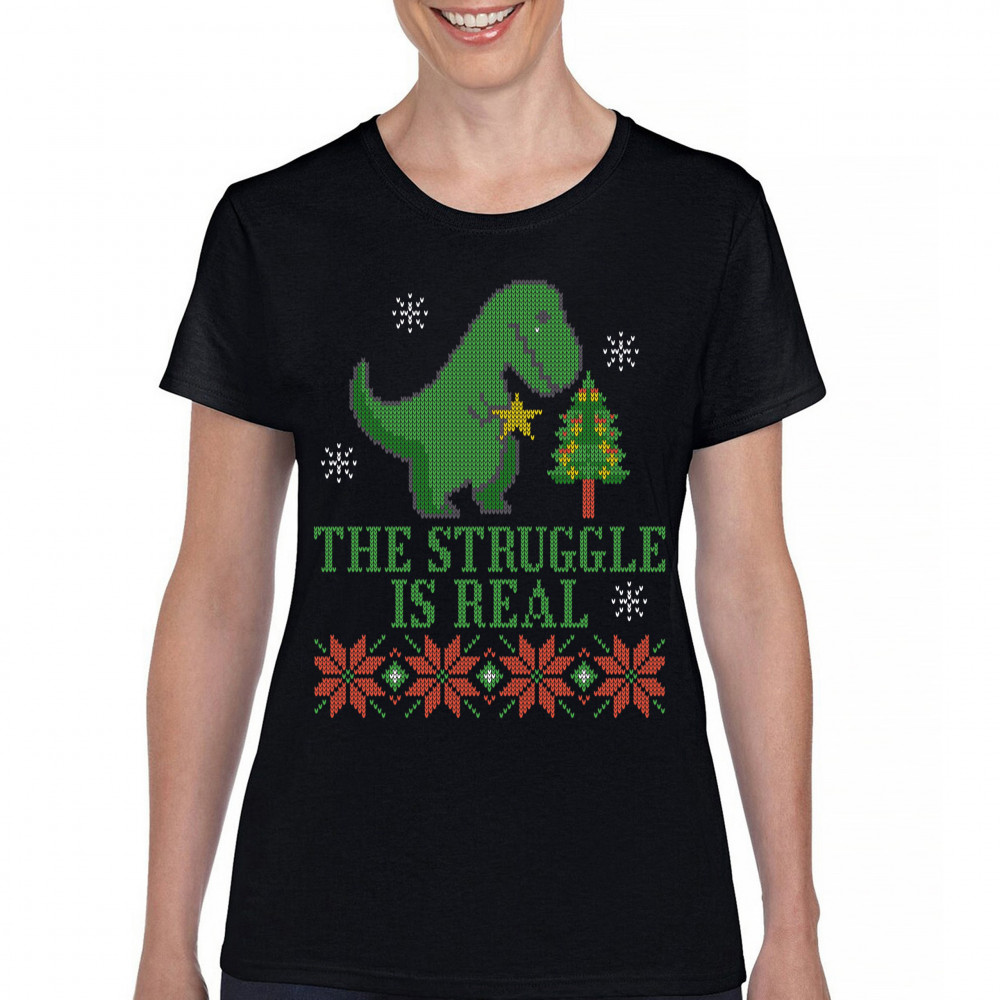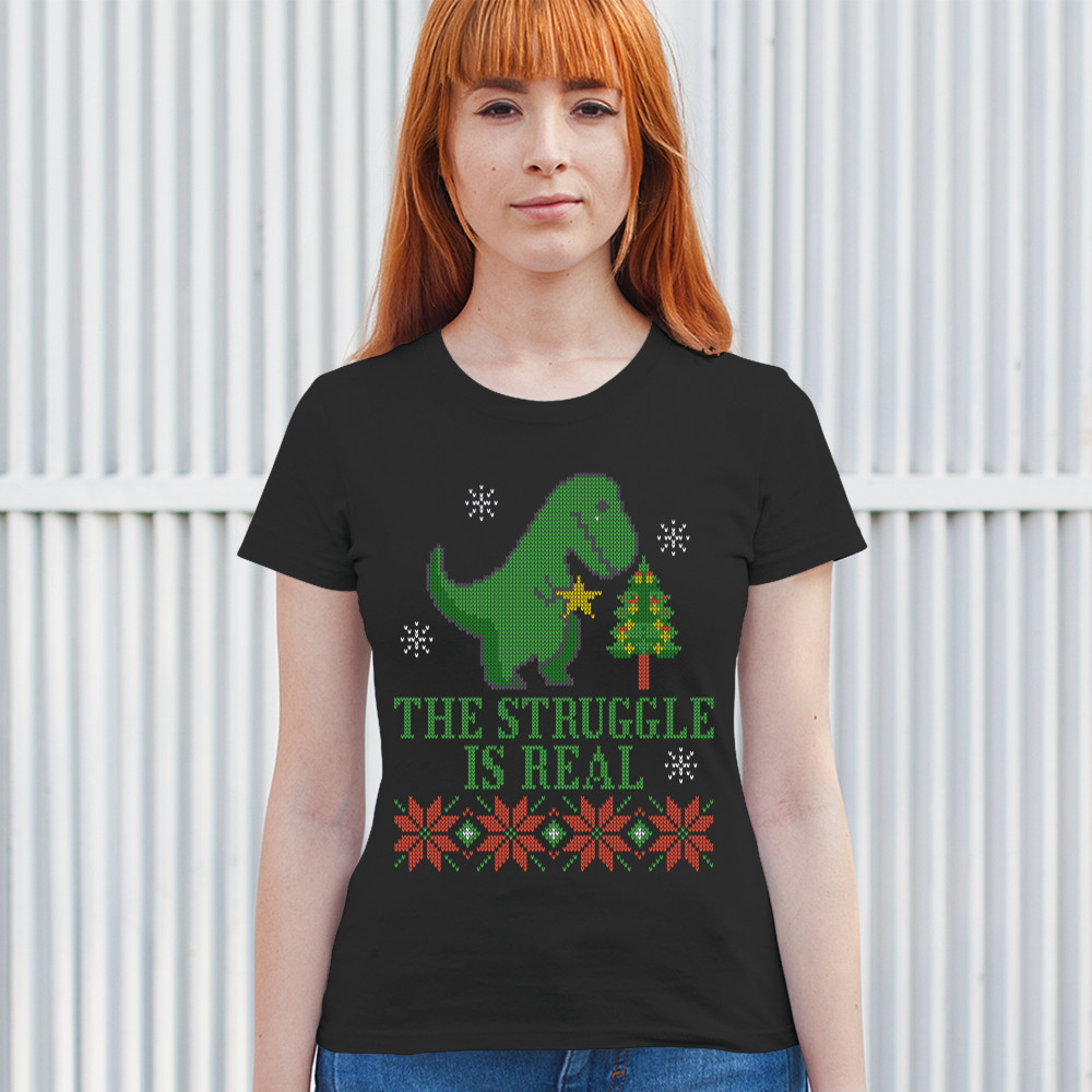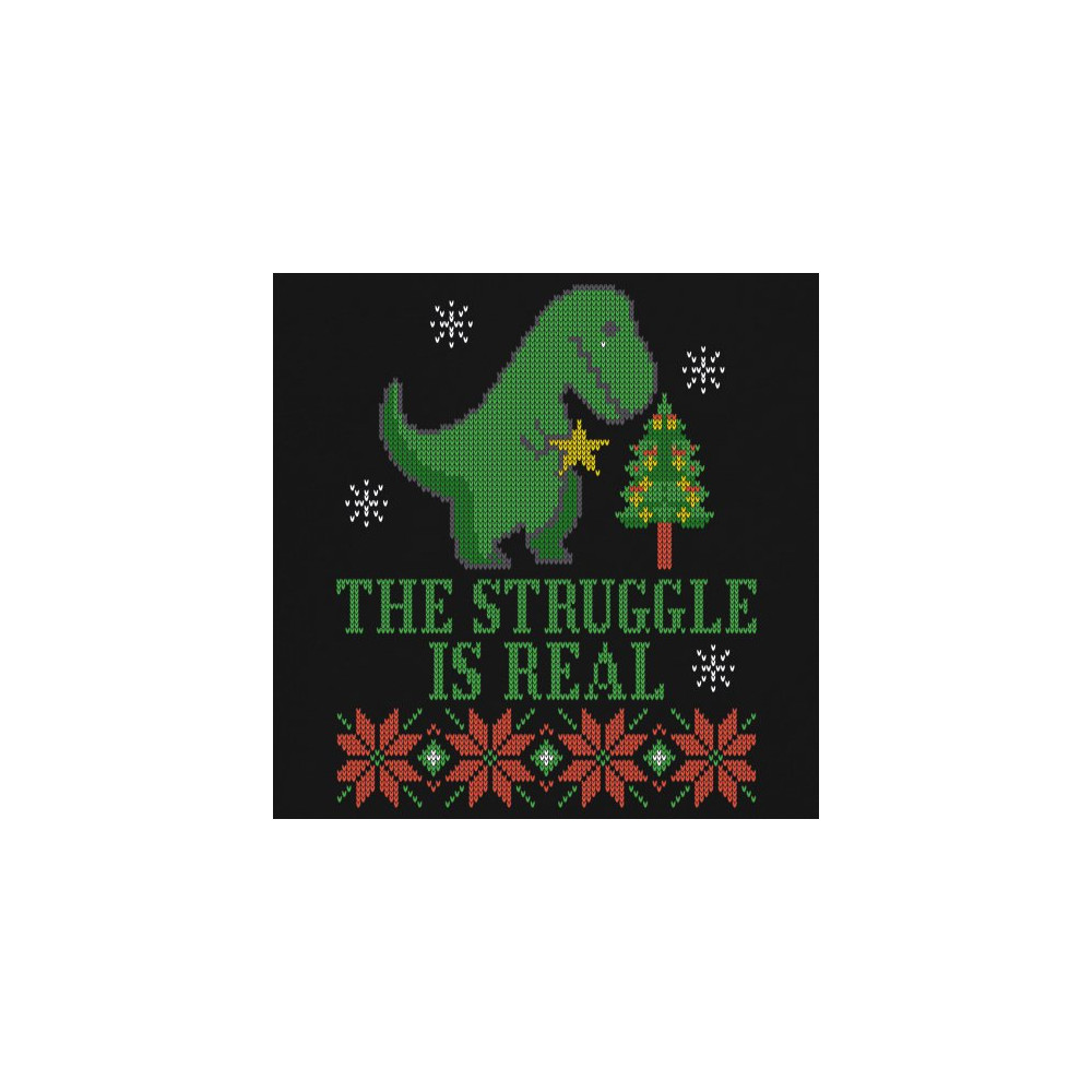 A funny print saying: "The Struggle Is Real" and featuring a sad tyrannosaurus rex holding a toy star in it's short hands standing by a Christmas tree. The print is decorated as an ugly sweater. Amazing choice to make people smile and spread positive vibe