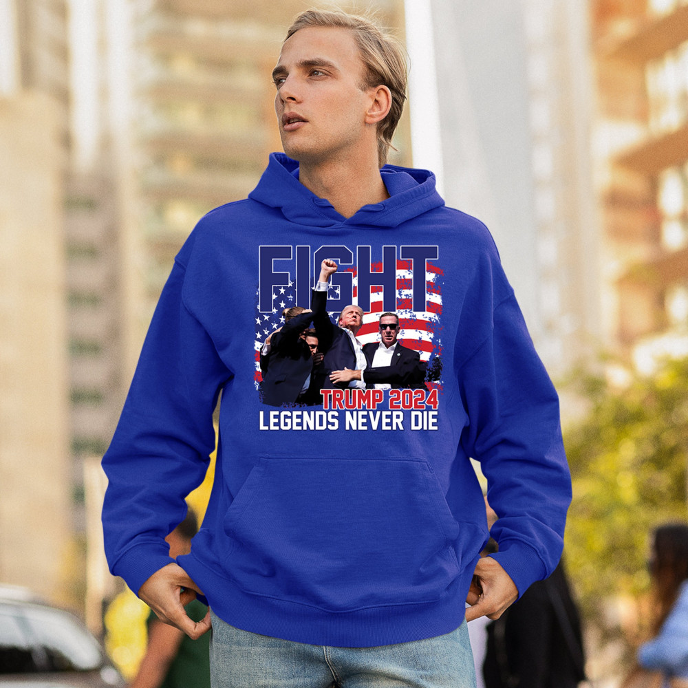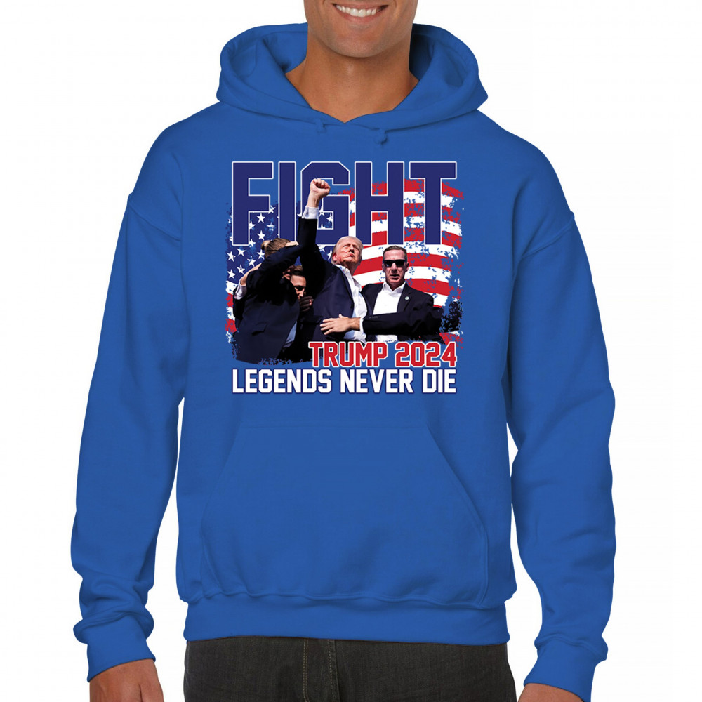 Show your Trump 2024 support with our bold "Fight" design, featuring "Legends Never Die" and a patriotic American flag. Perfect for rallies and everyday wear.