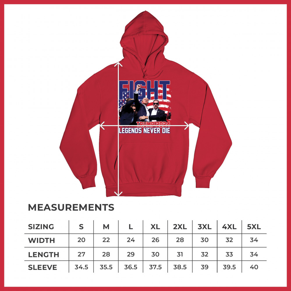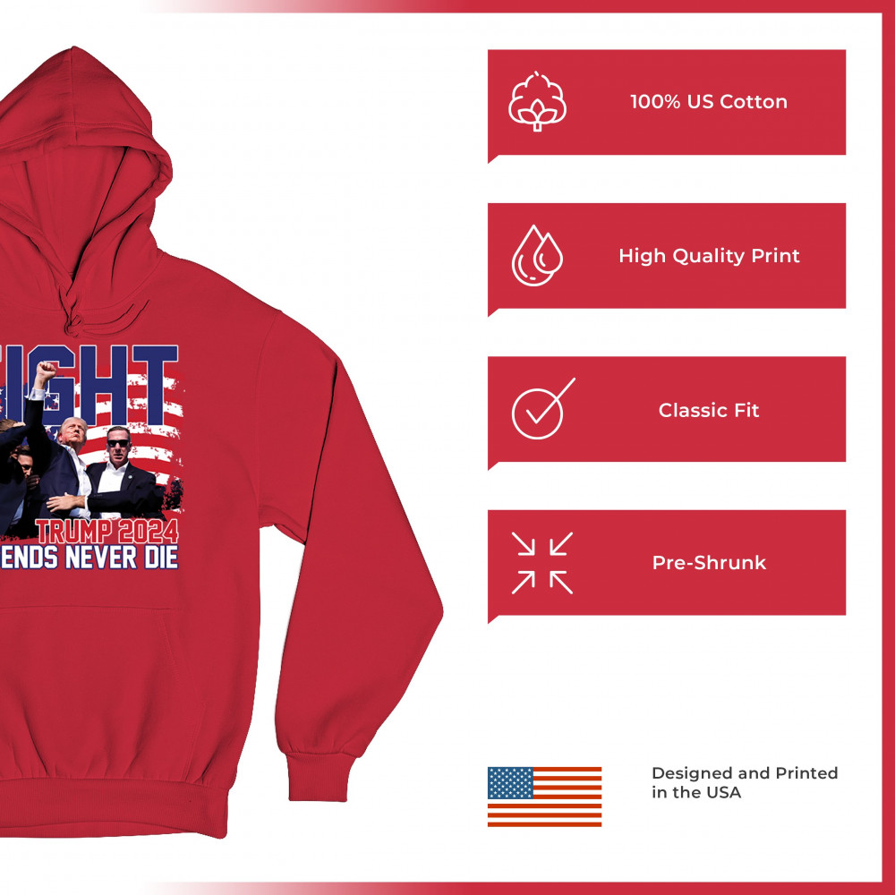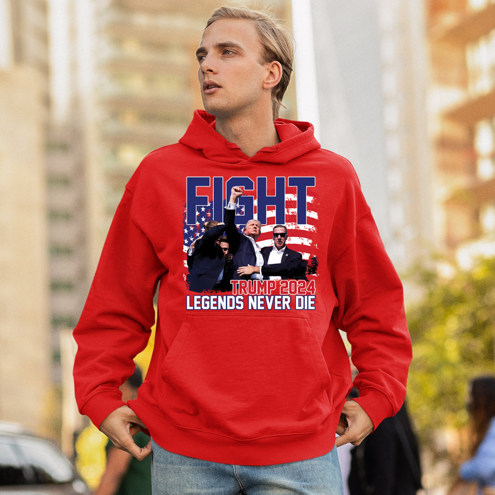Show your Trump 2024 support with our bold "Fight" design, featuring "Legends Never Die" and a patriotic American flag. Perfect for rallies and everyday wear.