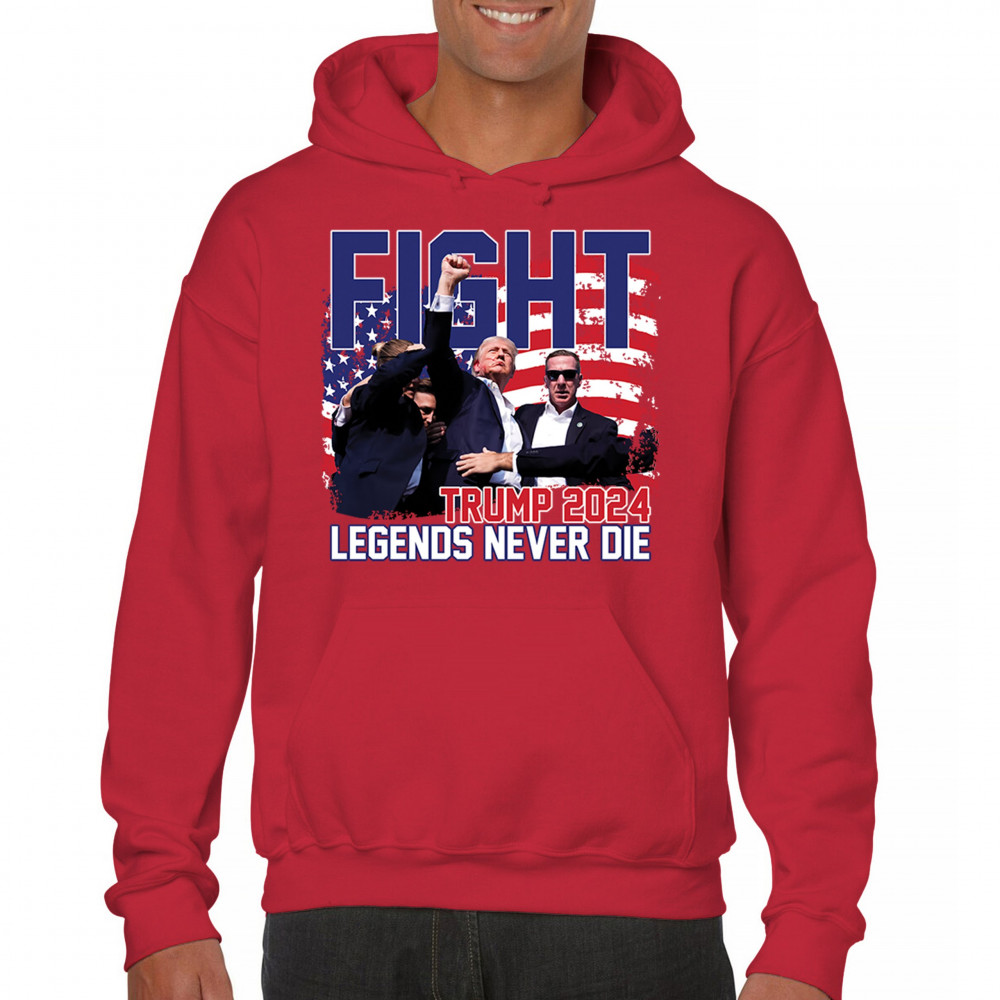 Stand proud and show your support for the Trump 2024 campaign with our exclusive "Fight" design. This striking graphic features Donald Trump alongside the inspiring phrase "Legends Never Die," set against a patriotic American flag backdrop. Ideal for rally events and everyday wear, this design captures the spirit of determination and victory. It’s perfect for those who stand by conservative values and trust in Trump's leadership. Celebrate your patriotism and join fellow supporters in making a bold statement for America's future with this must-have design.