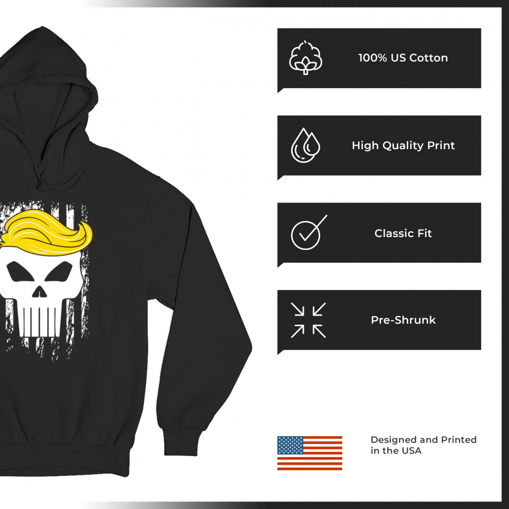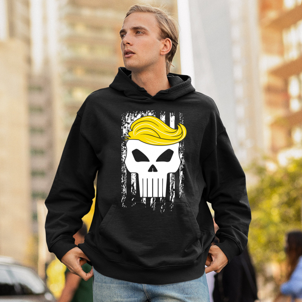 Explore our exclusive design - a symbol of unwavering support for America. Featuring a distressed flag and a skull with Trump's hair, it's perfect for patriotic conservatives