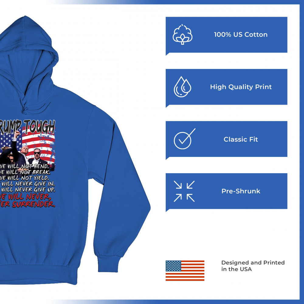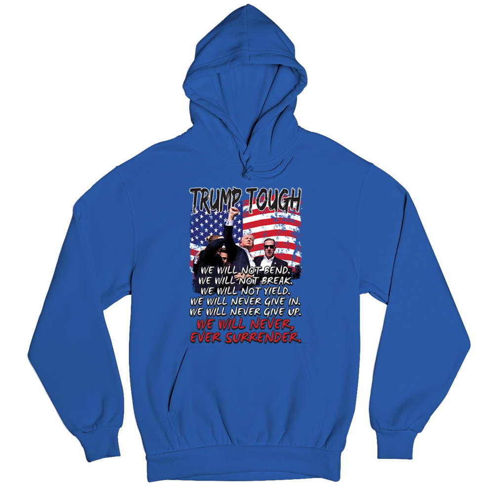 Express your support for Trump 2024 with this bold, patriotic design featuring the American flag and a powerful message. Never surrender your values.