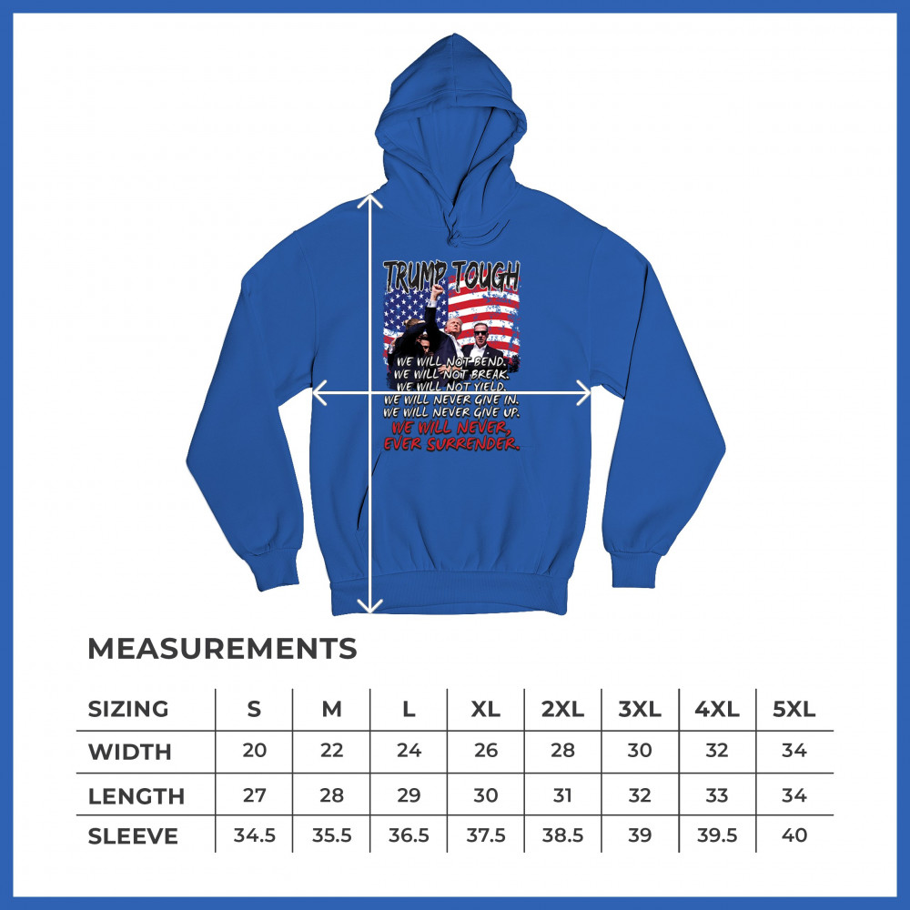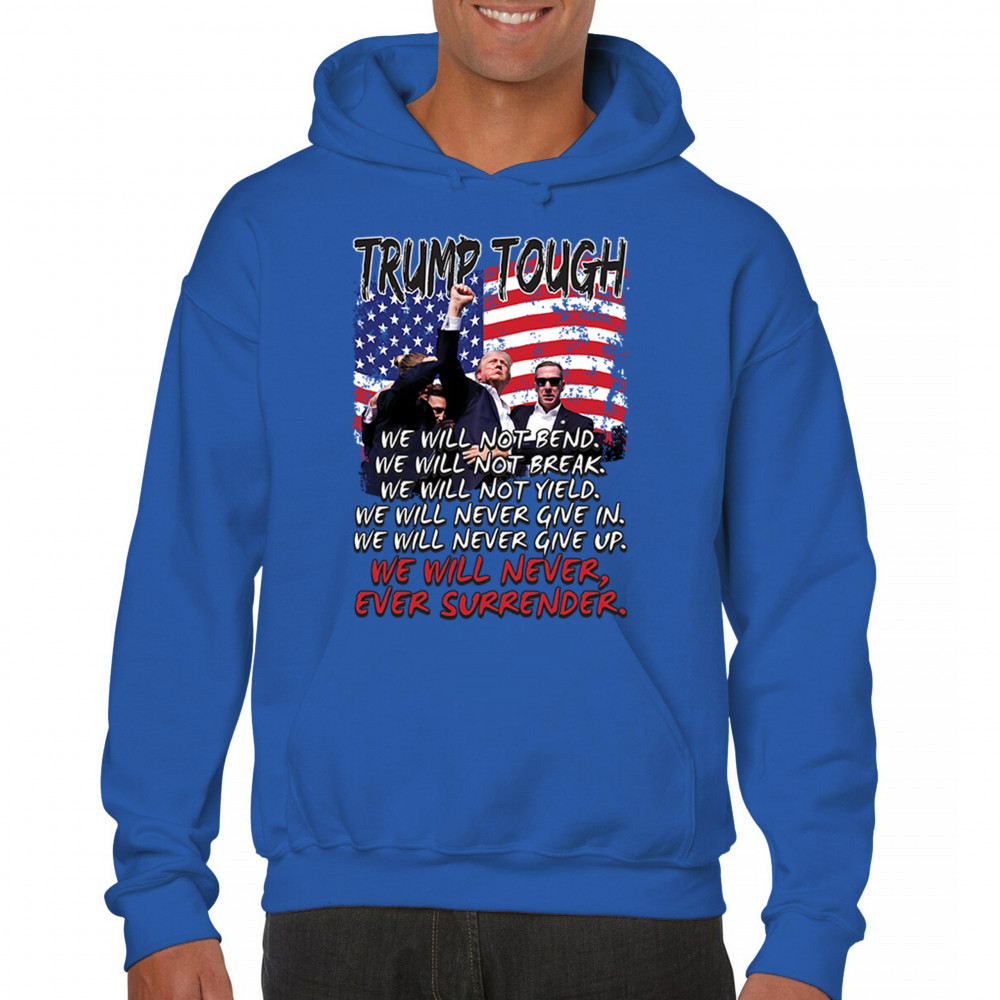Display your unwavering support for Donald Trump with this powerful design. Crafted for those who believe in conservative values and the America First agenda, it’s perfect for any rally or event. With a striking image and the American flag in the background, this design embodies the spirit of those who refuse to give up or surrender. Show your dedication and pride every time you wear this. Join the movement and stand firm in your beliefs.