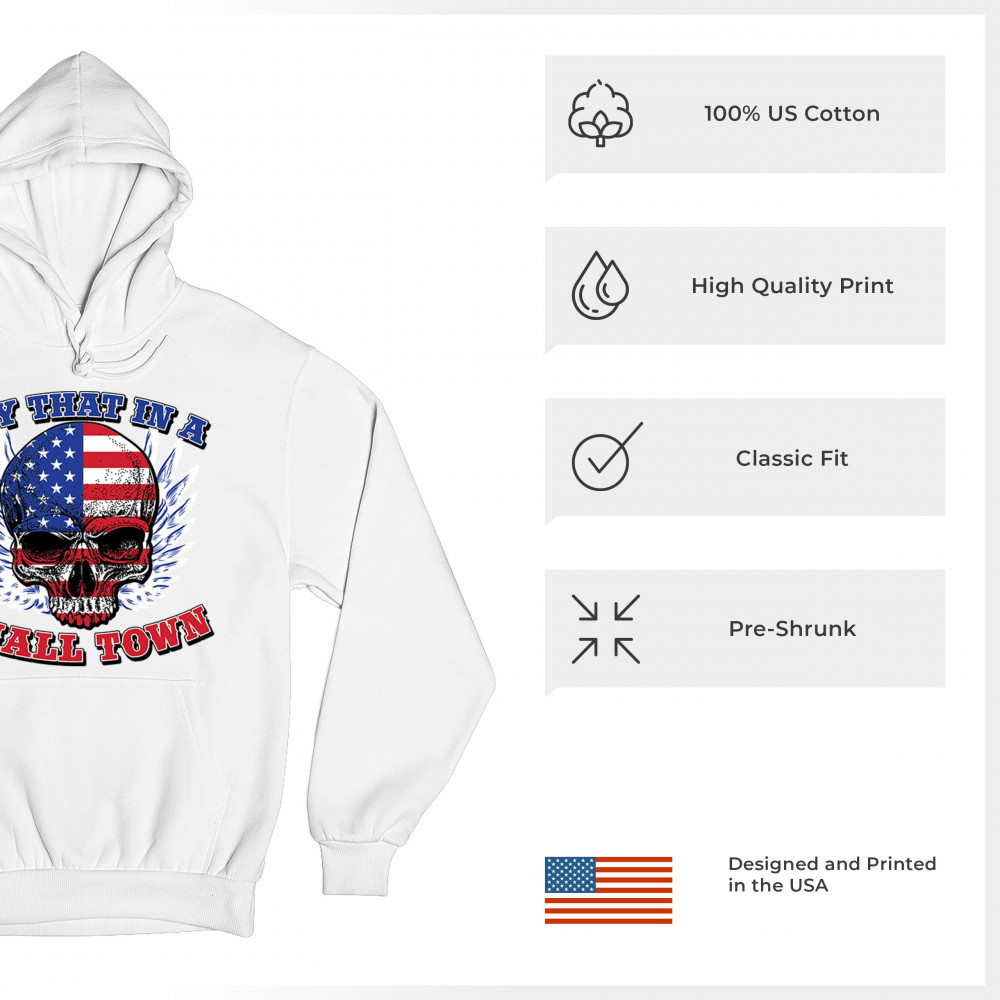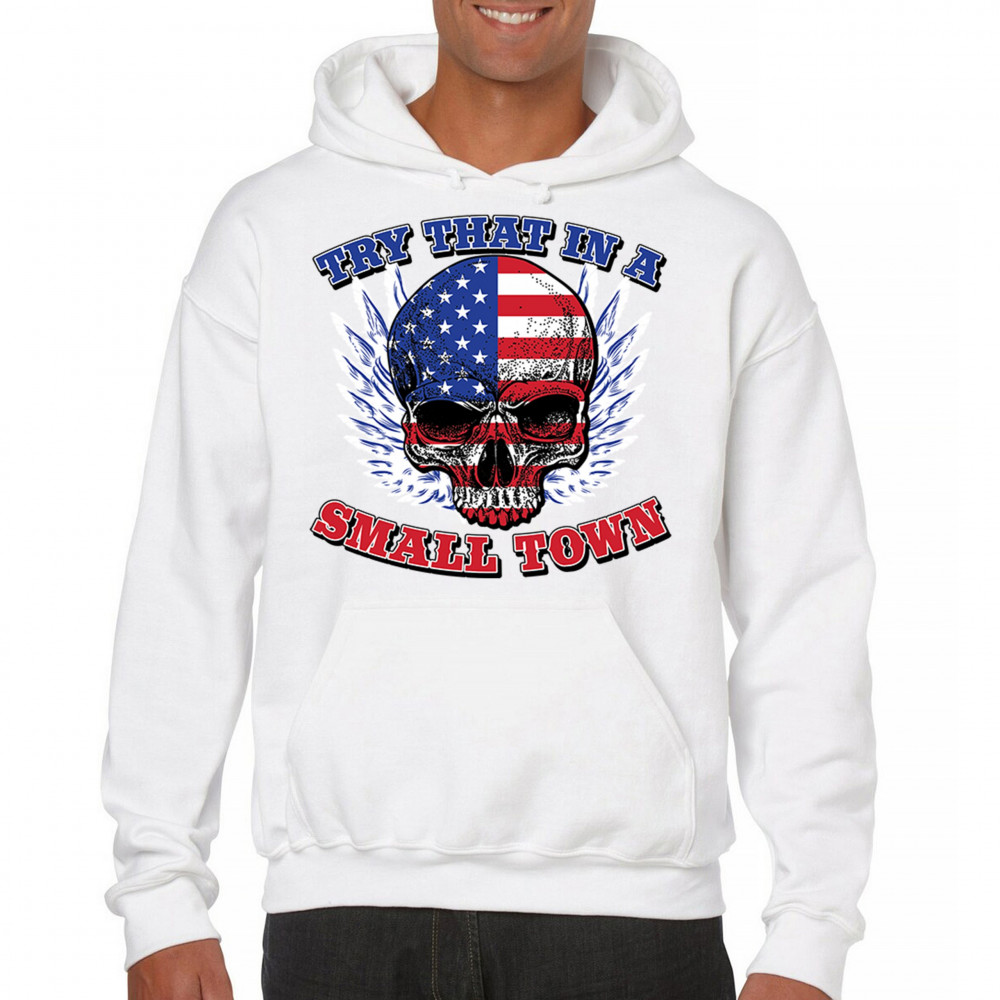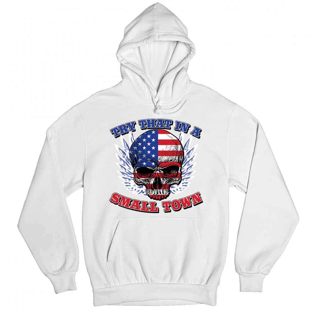 TRY THAT IN A SMALL TOWN sweatshirt american flag skull country music hoodie white