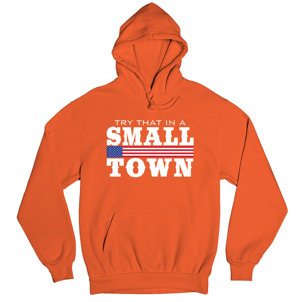 Celebrate small-town pride with our "Try That In A Small Town" design. Perfect for patriotic events, it features a bold American flag graphic.