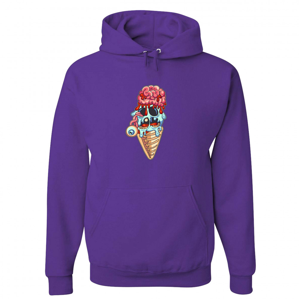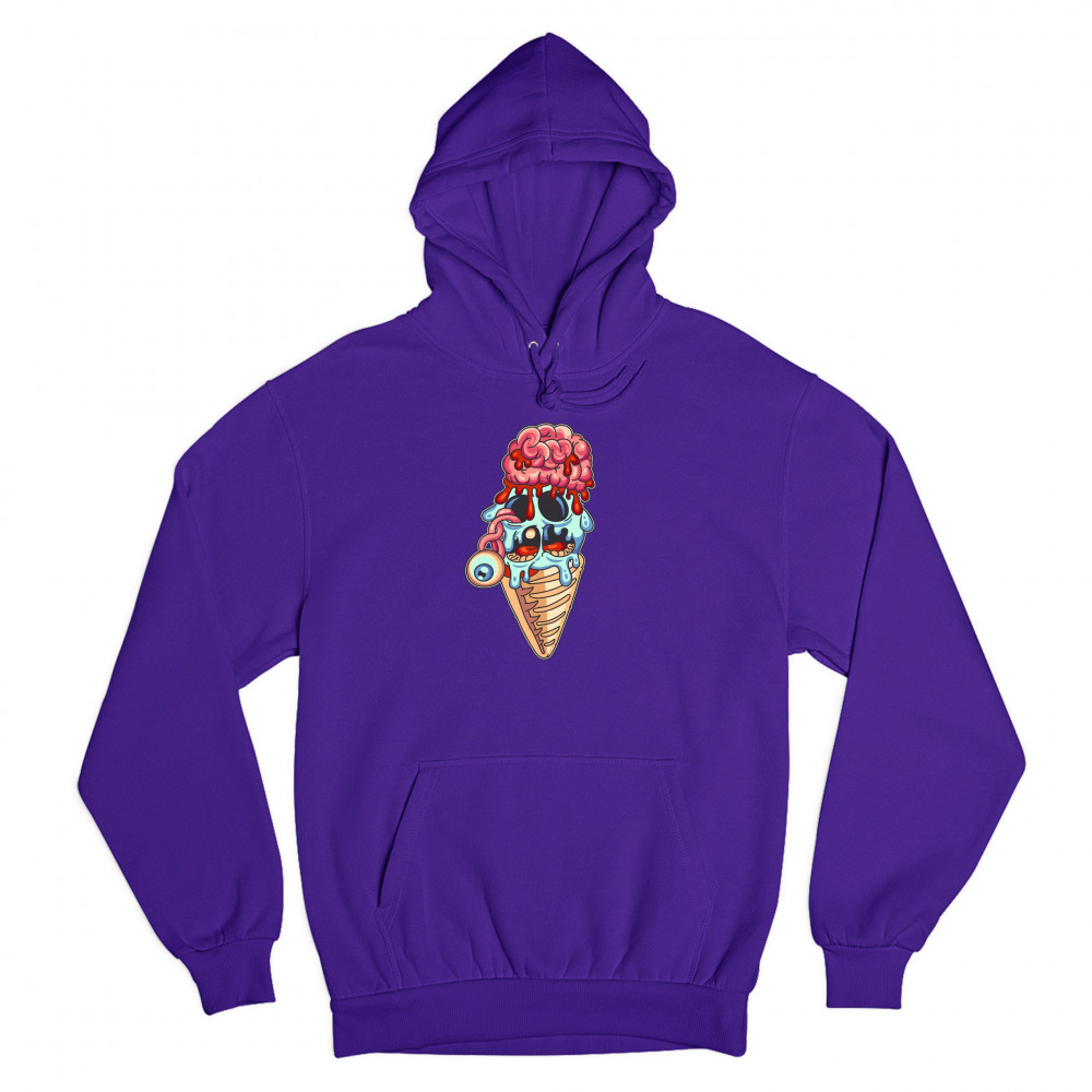 A print featuring an undead ice cream. The ice cream ball looks like a head of a zombie with an eye popping out and hanging and bloodied brains attached on top. A great choice for a person who is into horror movies, haunted houses and freaking people out!