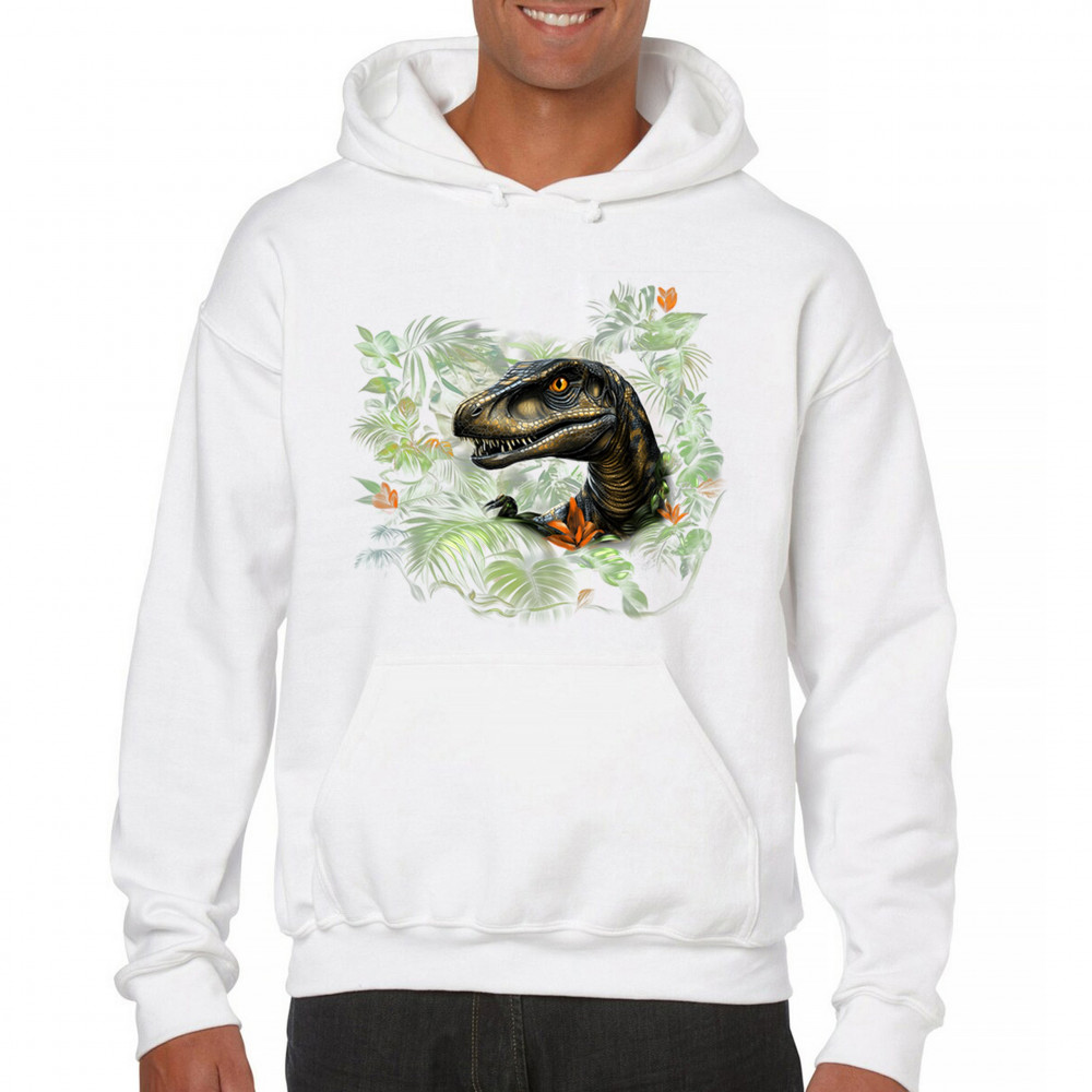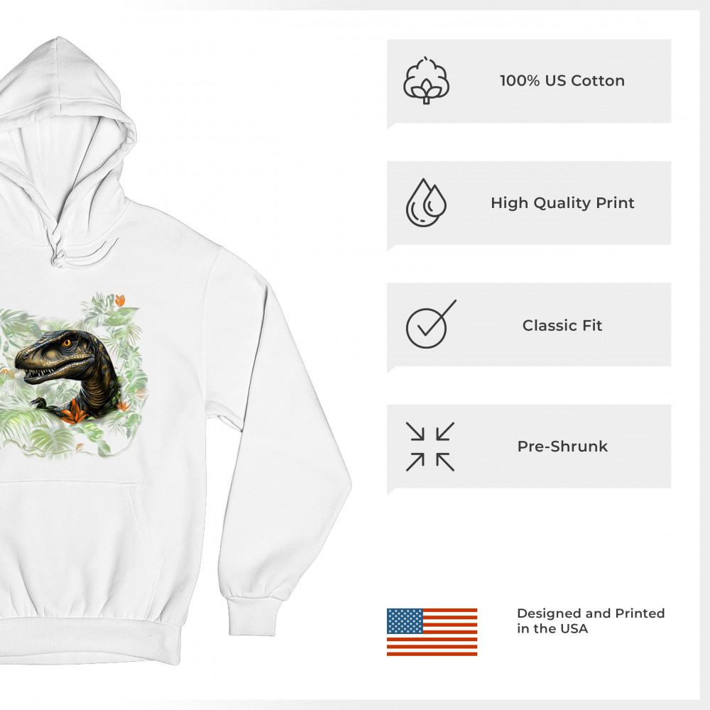 Step into the wild with this striking jungle raptor design. A highly detailed velociraptor peeks from vivid tropical foliage and flowers, perfect for dinosaur lovers, fossil fans, and ancient creature enthusiasts. Whether for Jurassic adventures, museum trips, or themed events, this design unleashes untamed prehistoric energy.