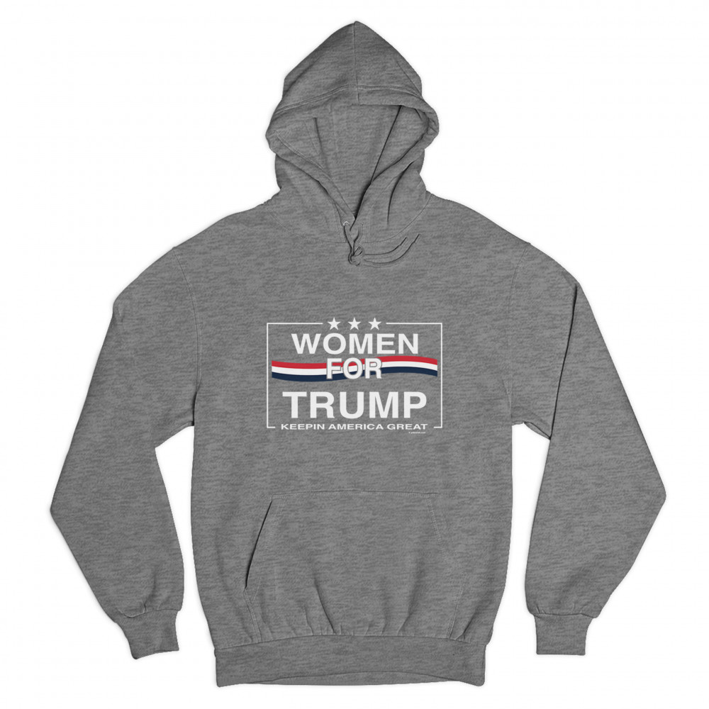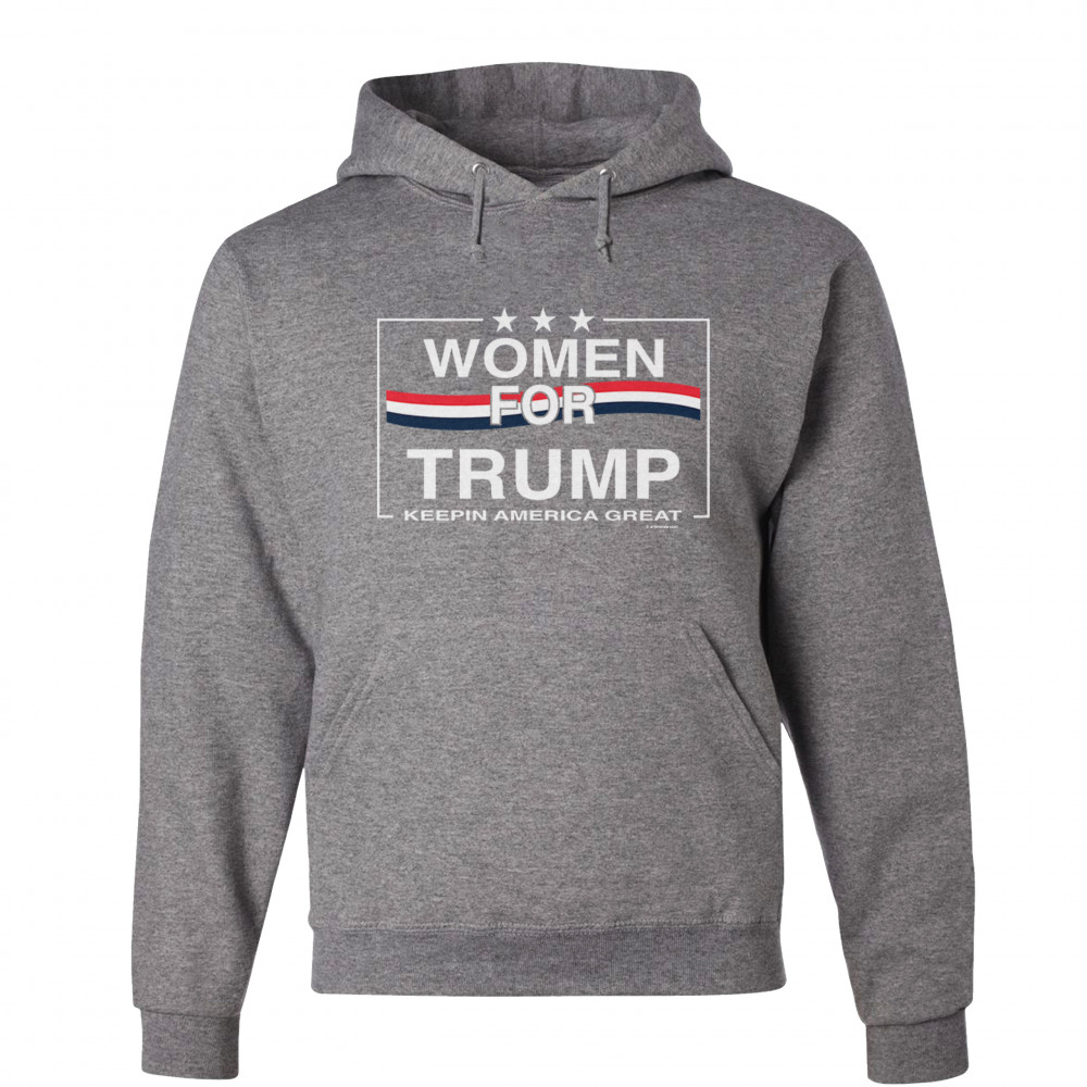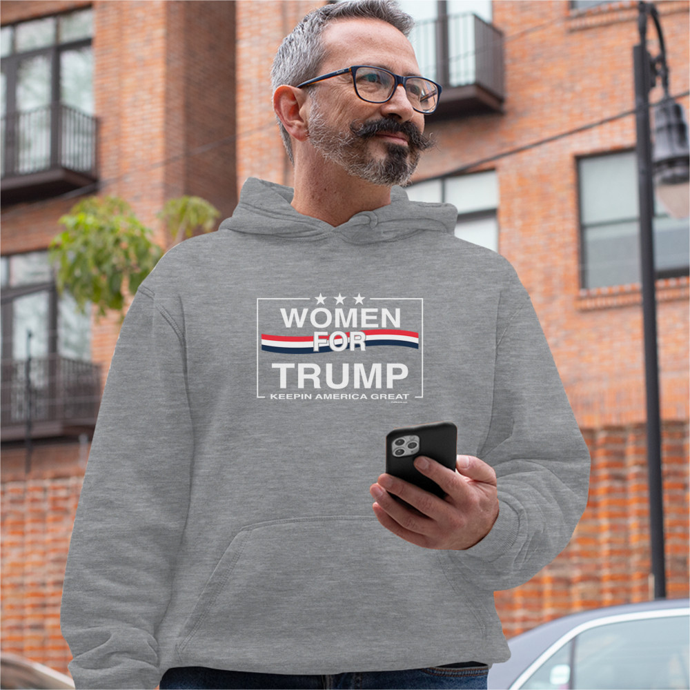 A political print saying "Women for Trump keepin America great". There are three stars above the caption and in the background there is a three-colored stripe. A great choice to wear for a Trump rally or give as a gift to a Donald Trump and Mike Pence supporter before 2020 presidential elections.