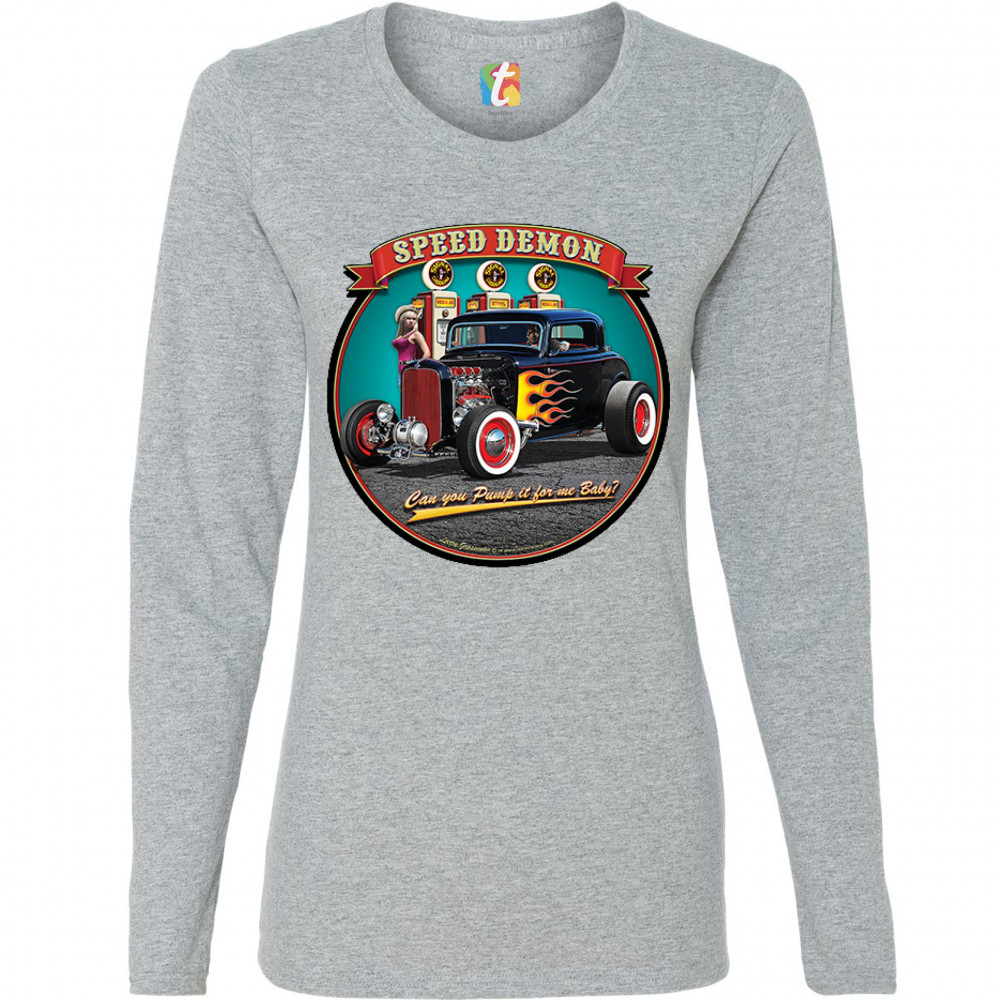 A print featuring a 1932 Ford Deuce hot rod coupe standing by a gas station. There is a cowgirl leaning on a gas pump. The print says: "speed demon" and underneath the car "Can you Pump it for me baby?". A great choice for Route 66 and hot rod fans.