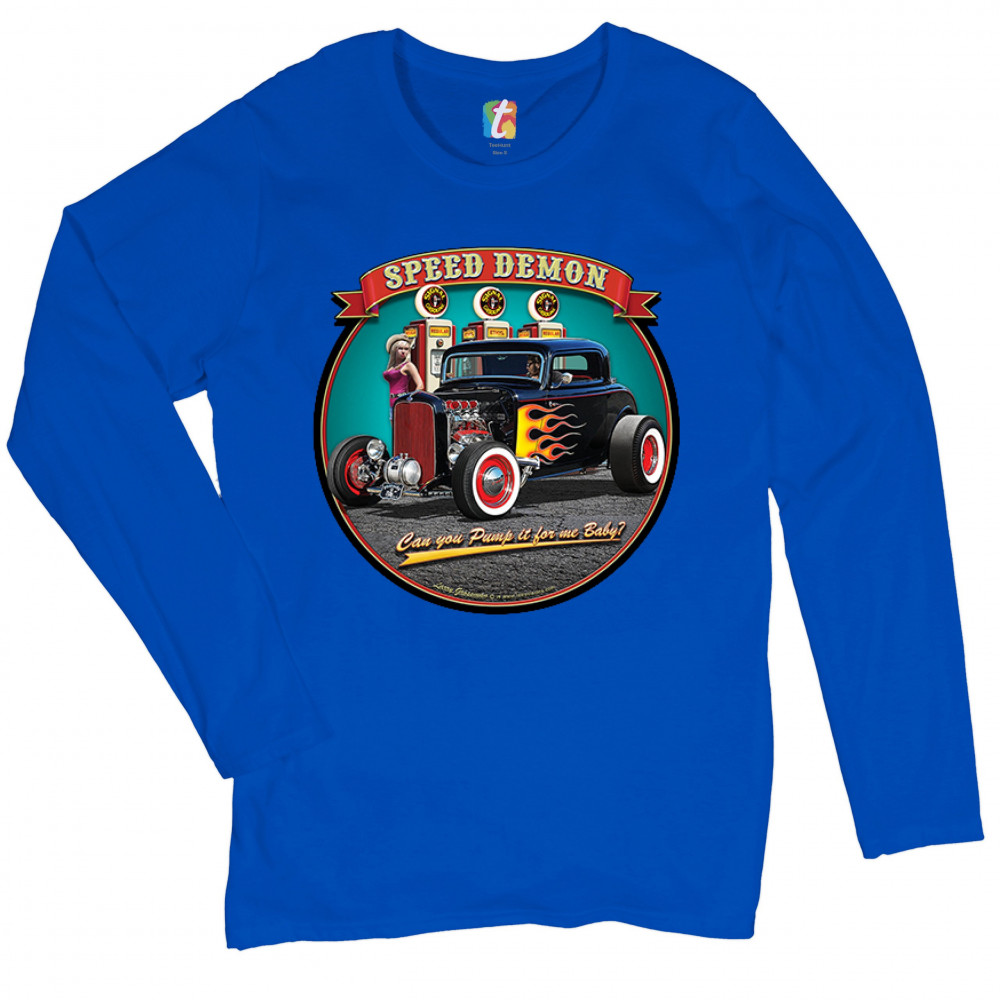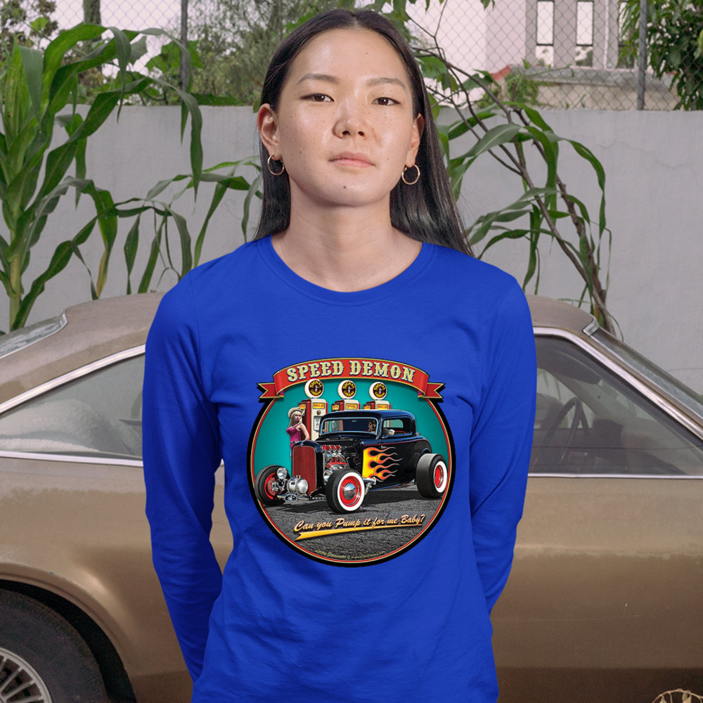 A print featuring a 1932 Ford Deuce hot rod coupe standing by a gas station. There is a cowgirl leaning on a gas pump. The print says: "speed demon" and underneath the car "Can you Pump it for me baby?". A great choice for Route 66 and hot rod fans.