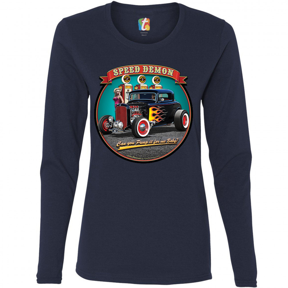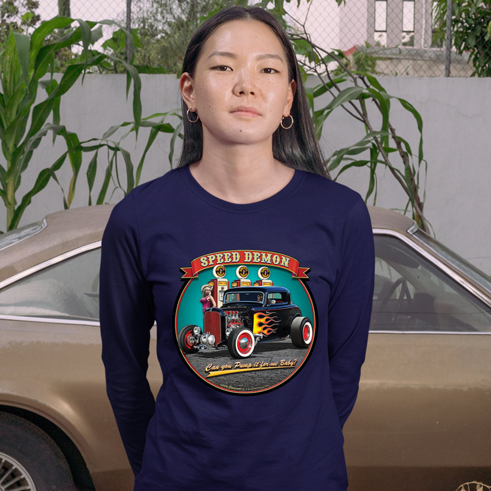 A print featuring a 1932 Ford Deuce hot rod coupe standing by a gas station. There is a cowgirl leaning on a gas pump. The print says: "speed demon" and underneath the car "Can you Pump it for me baby?". A great choice for Route 66 and hot rod fans.