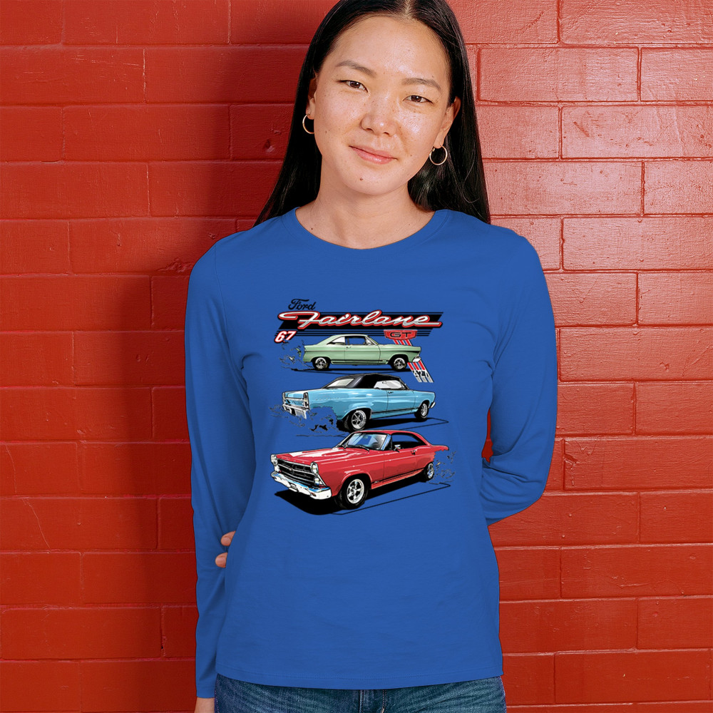 Features three 1967 Ford Fairlane GTs with retro burnout style. Great for muscle car fans, Ford collectors, car shows, and vintage meetups.