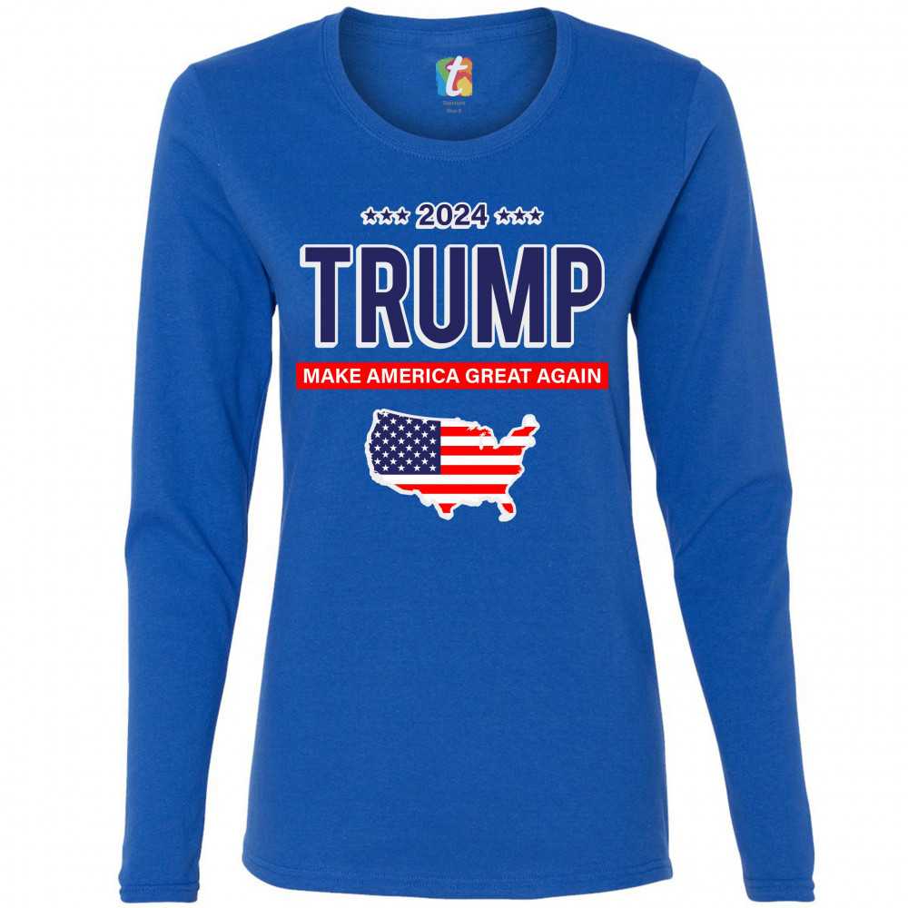 A political print saying "2024 Trump Make America Great Again" and features the silhouette of the USA with the American flag inside of it. A great choice to wear for a Trump rally or give as a gift to a Donald Trump supporter before 2024 presidential elec