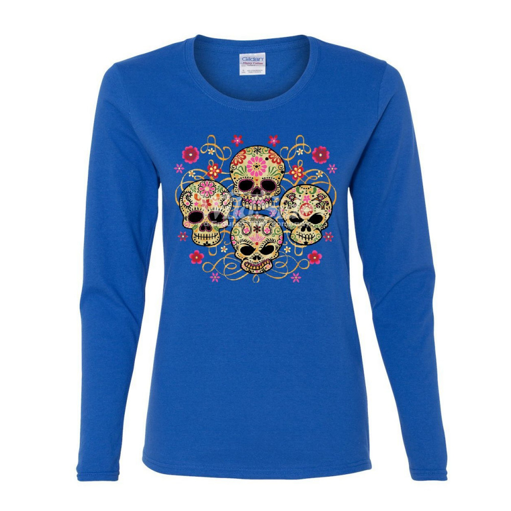 4 CUTE SUGAR SKULLS women's long sleeve tee calaveras dia de los muertos mexico royal blue