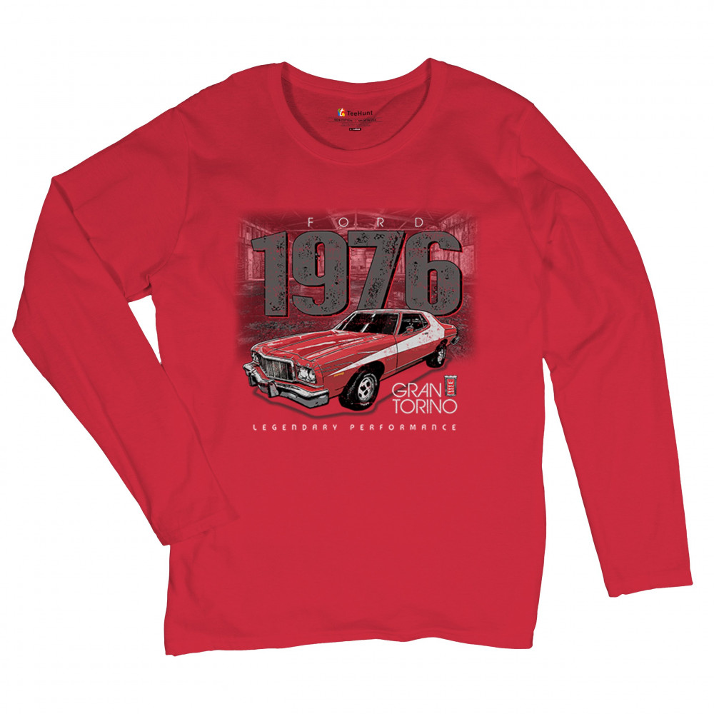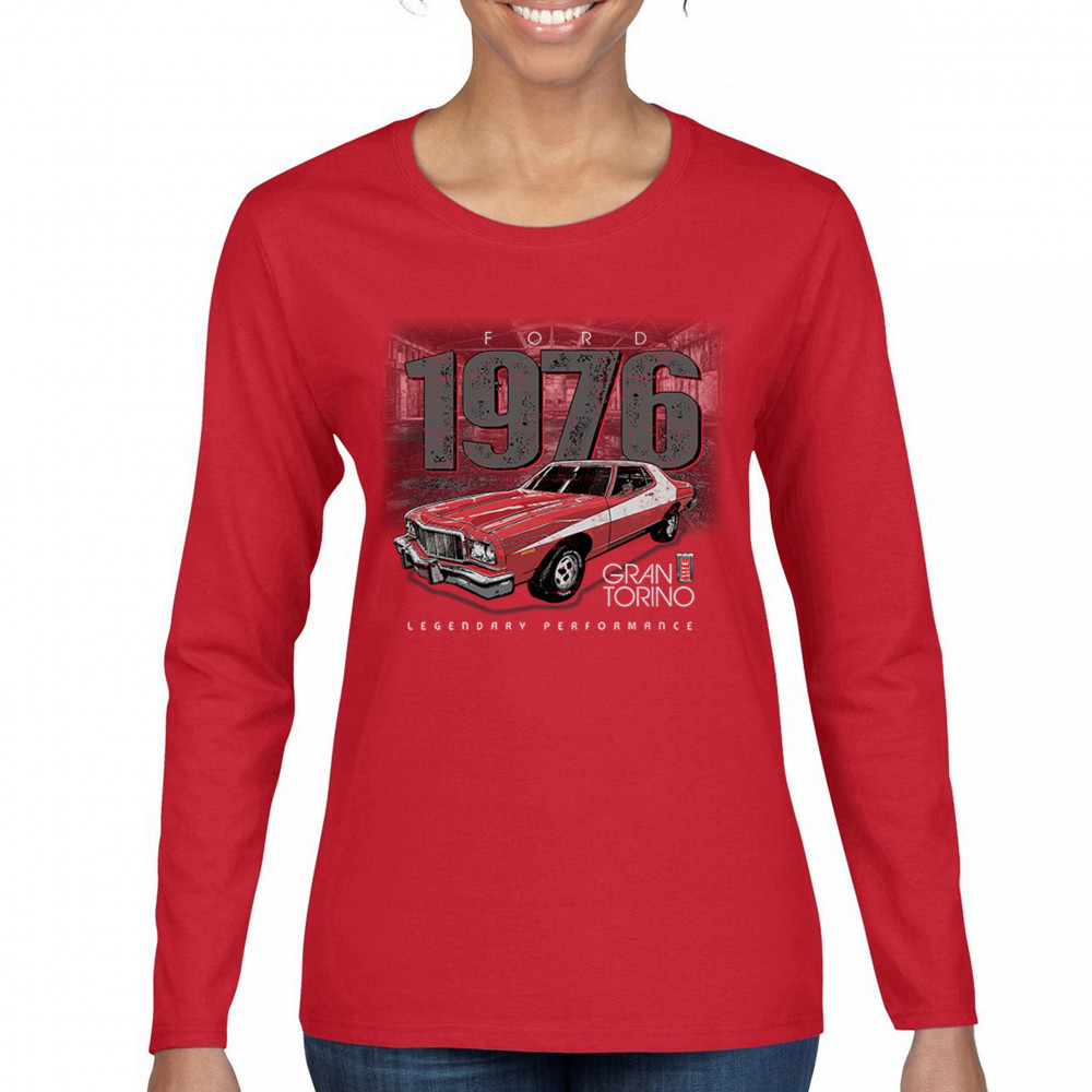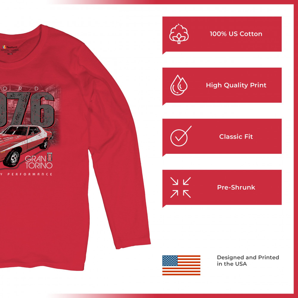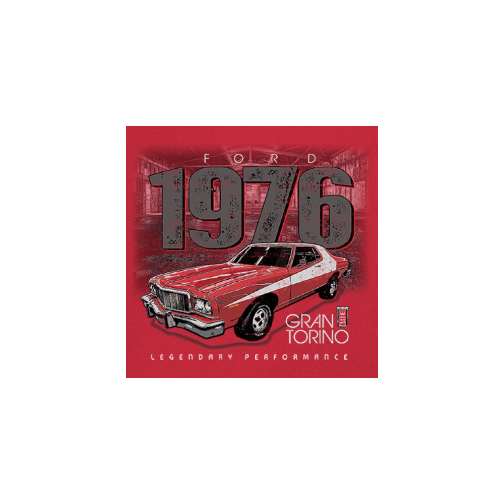1976 Ford Gran Torino design with red and white retro style. Perfect for muscle car fans, Ford lovers, and classic car event gear.