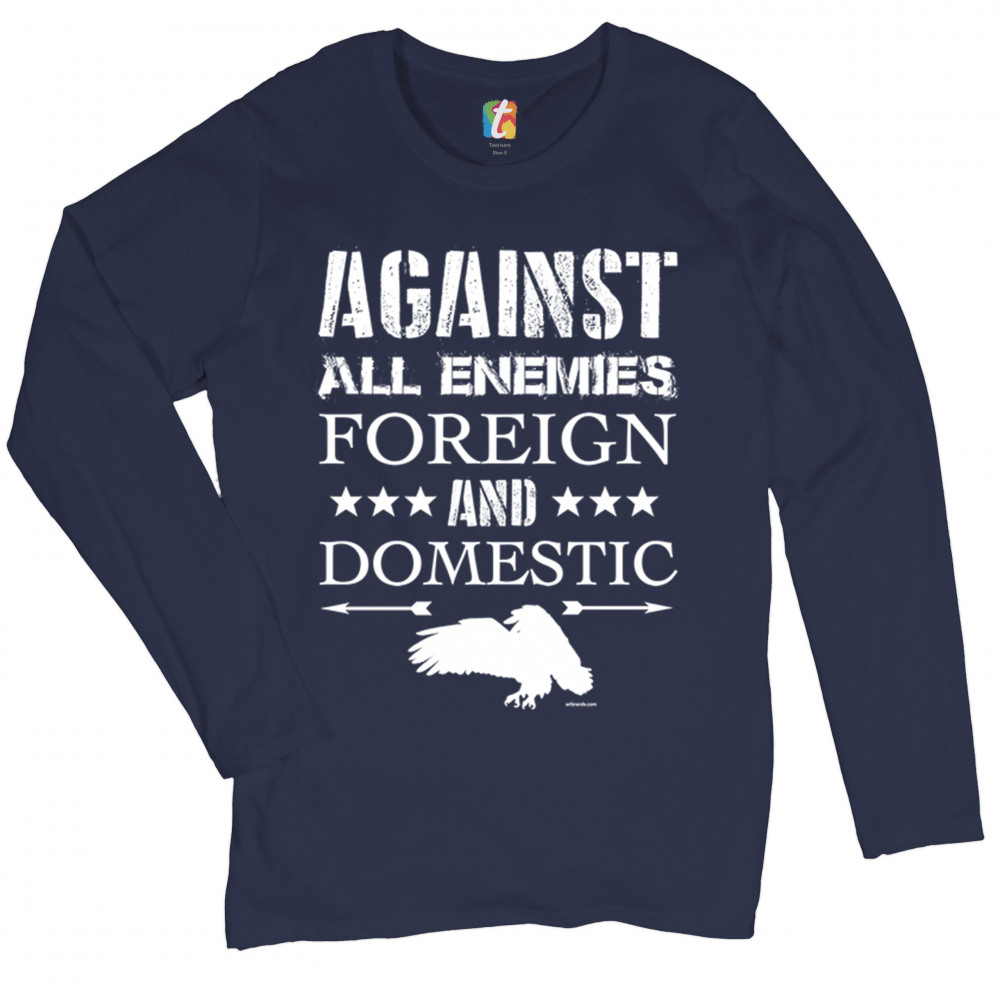 A patriotic print saying "Against All Enemies Foreign and Domestic" and featuring a silhouette of an eagle. Great choice to wear on Independence Day or any other patriotic holiday.