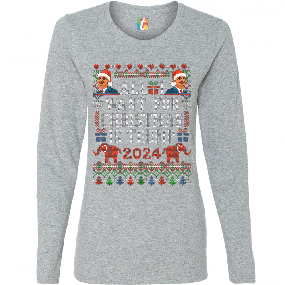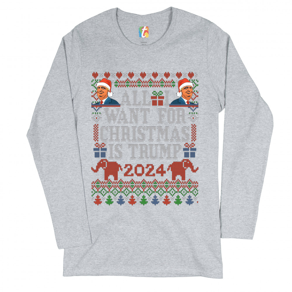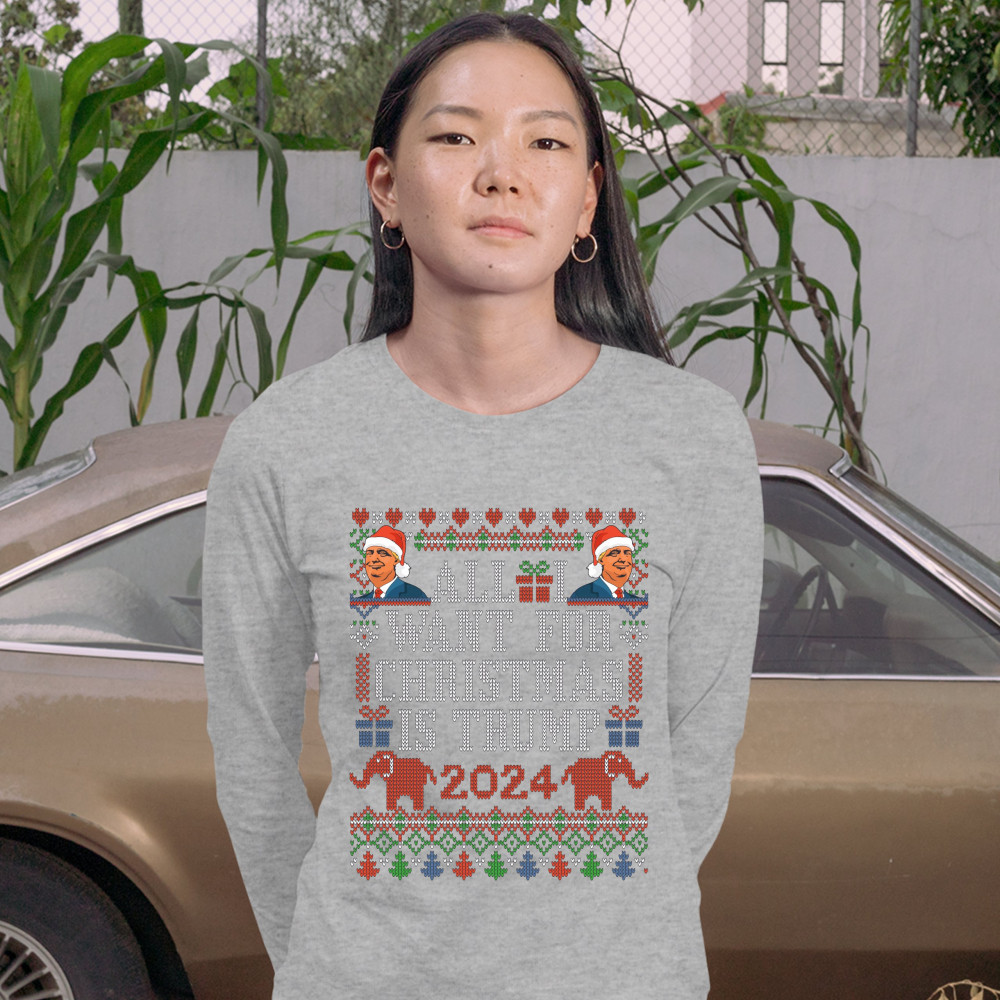 A funny print saying: "All I Want for Christmas Is Trump 2024". The print is decorated as a Christmas ugly sweater and features faces of Donald Trump wearing Christmas hats and two elephants. A great choice to wear for a Christmas or New Year's Eve party
